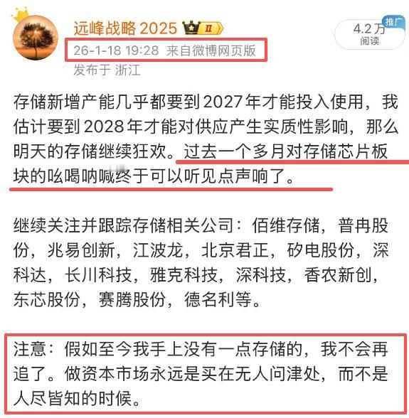 最后一次在这里说存储了,留个纪念,过去一段时间,我一直力挺半导体芯片,尤其力挺其中的存储芯片,即便一个多月前存储屡屡高开低走,屡屡不温不火,我依旧力挺到底,正如早上我所说的春种一粒籽,秋收万颗粟,今天对我个人来说是收获的时候了,跟寒武纪一样,现在只留了少部分当个纪念品。 做资本市场永远是买在无人问津处,而不是人尽皆知的时候,恰好我也不是个爱凑热闹的人。存储的行情走完了么?我认为还没有,目前实体存储的问题,暂时是无解的。人工智能时代短期缺算力,中期缺电力,但永远缺存储。 近段时间,我打算到端侧AI芯片的地方去洒几颗籽,那里目前门庭冷落,没什么人耕种,我不怕荒凉,也不怕人烟稀少,还奋战存储的兄弟们,希望都有个好收成。