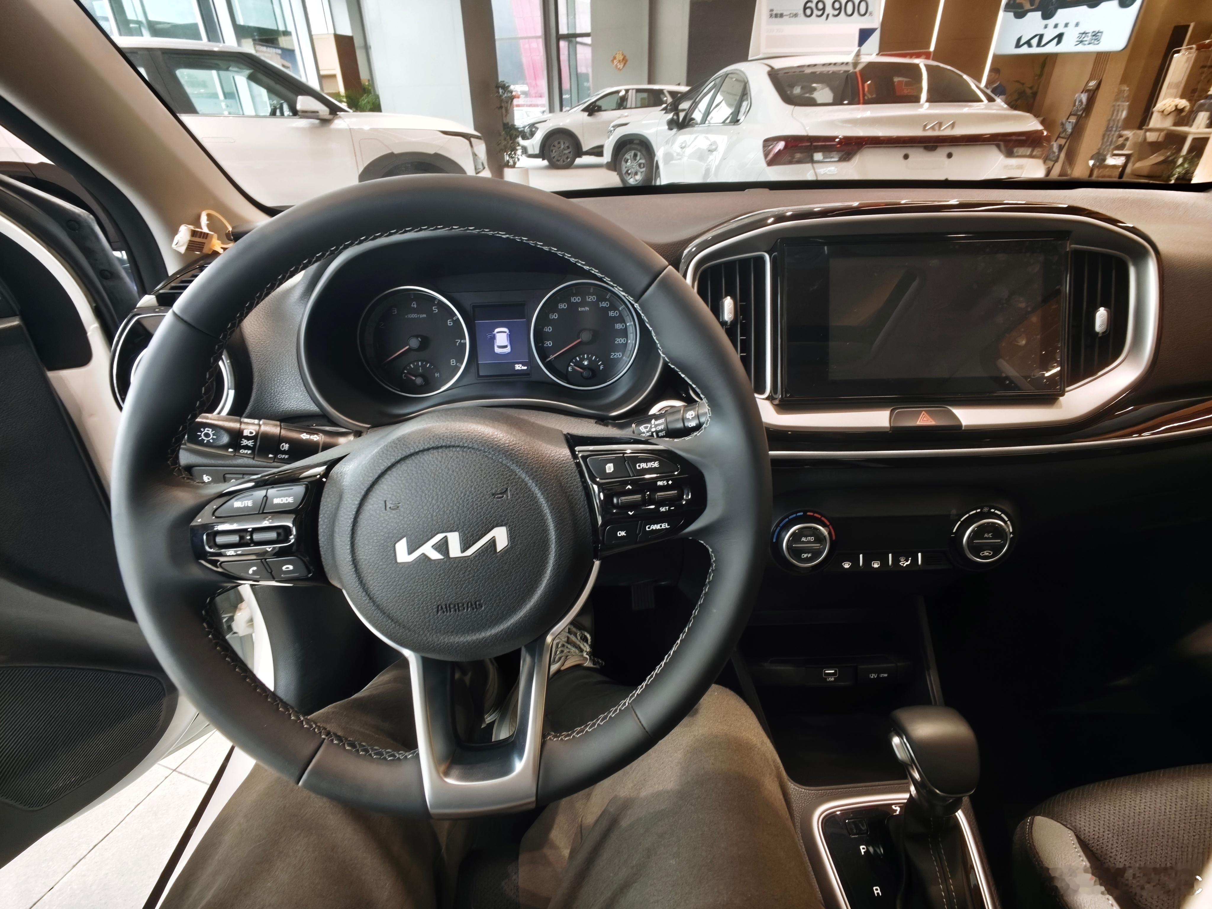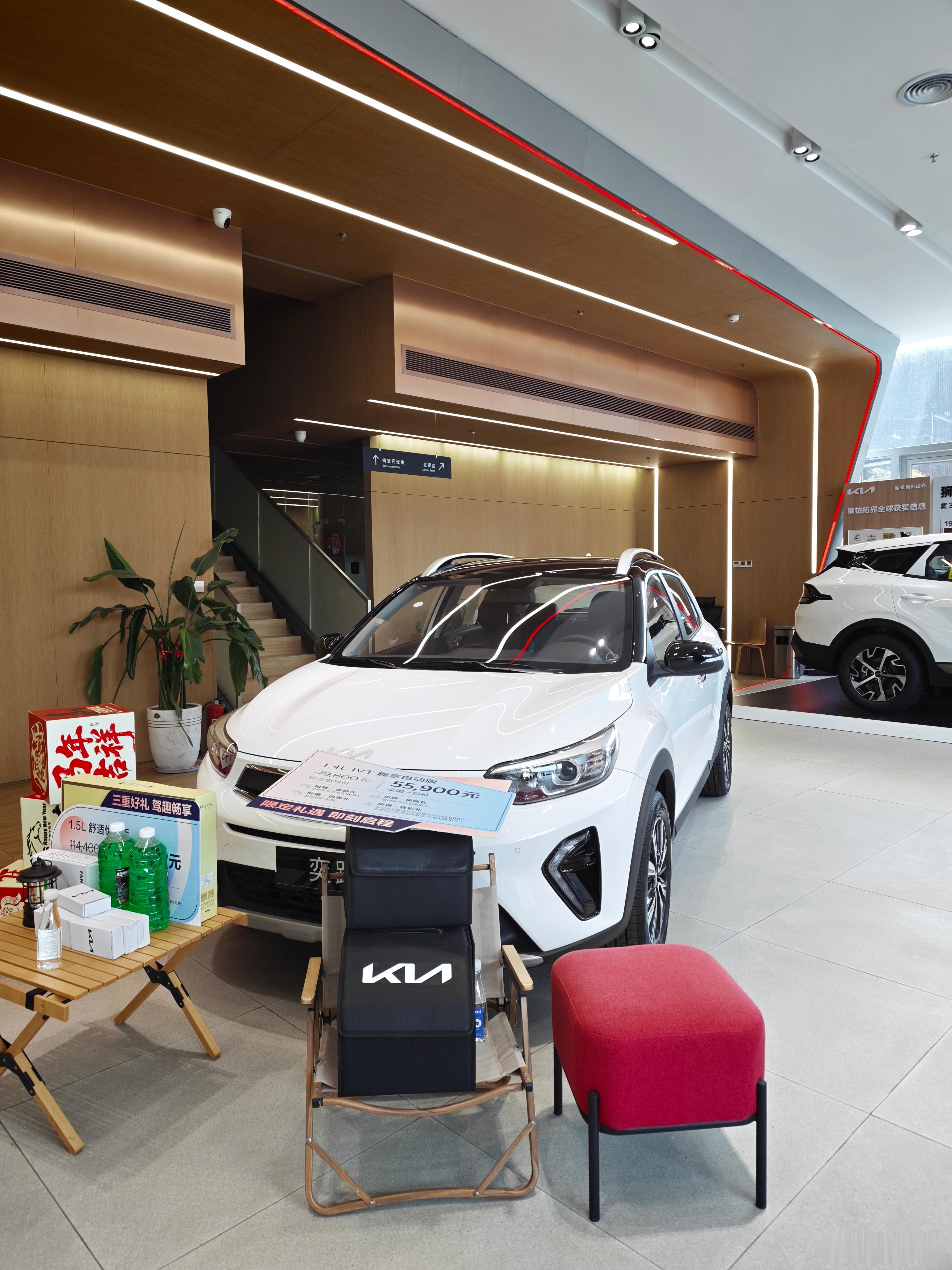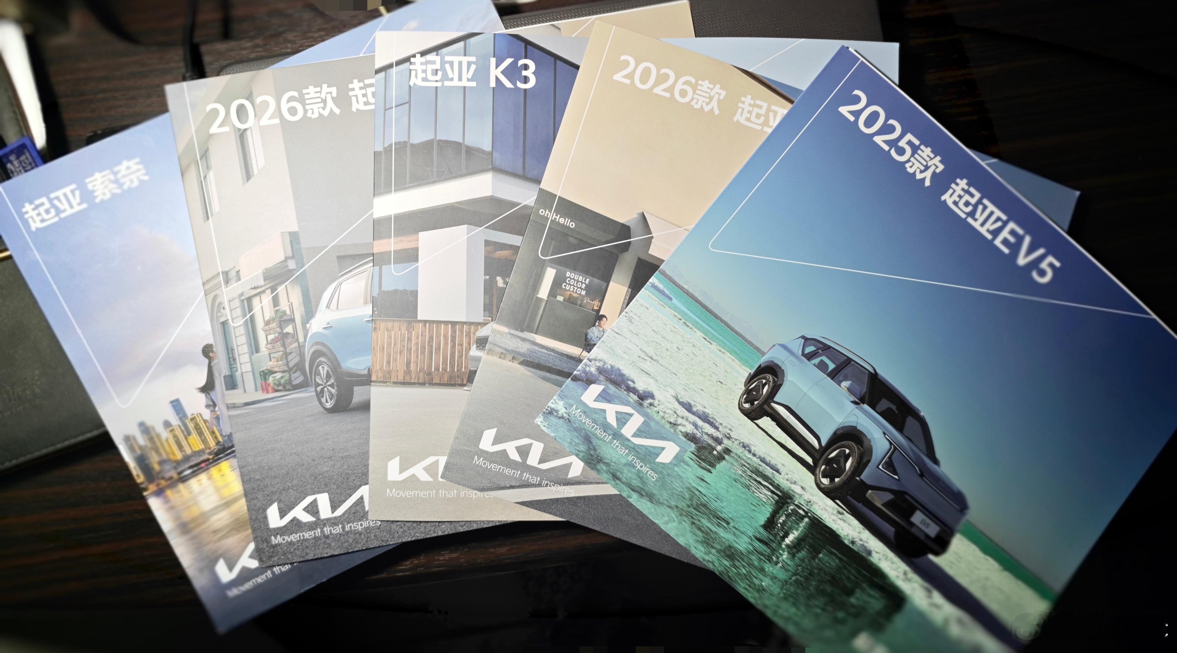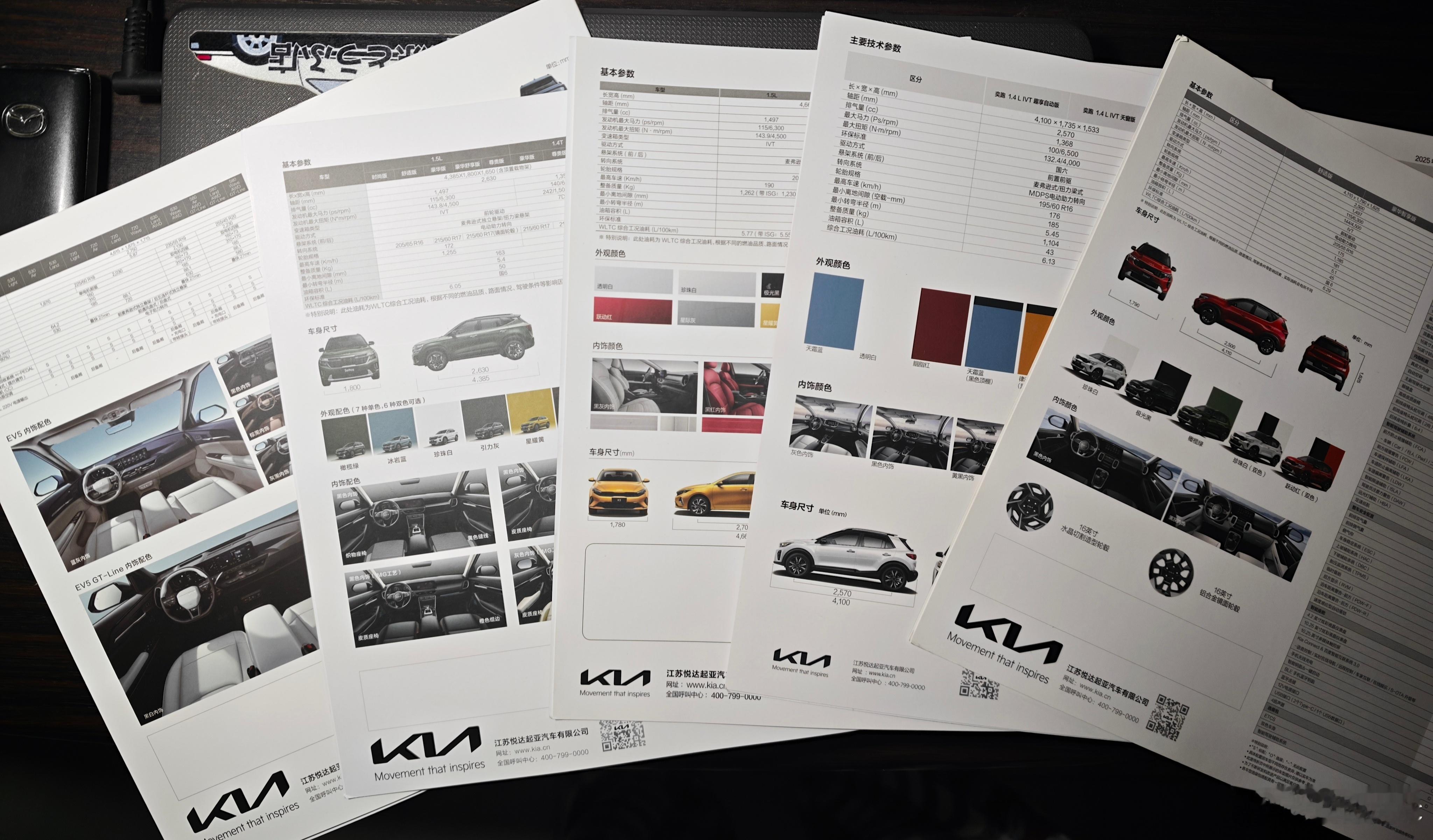 说到起亚,这台它们的主销车型也很有意思。奕跑现在的价格变成了5.59-5.99万,有比较得体的配置,甚至能给你装上下坡辅助,虽然我也不知道这个配置出现在这种定位的车上有什么用。简单看了一下,作为一台工具是非常合格的。看起来比较正经,空间不大但够用,不用缩成一团,到处是硬邦邦的塑料但座椅是假皮,有满满当当的方向盘按键,甚至有自动空调、大屏、前雷达和坐垫倾角调节,这套1.4L发动机➕CVT变速箱也不具备什么问题滋生的土壤,卖的好点也理所应当了,门口就有3台待交车的。起亚也是为数不多坚持印刷官方实体宣传册的车企了。并且值得赞扬的是,起亚在每款车上都给出了丰富的内外颜色搭配,尤其是内饰,最少都会给出深浅两种搭配,浅色内饰爱好者实名赞赏