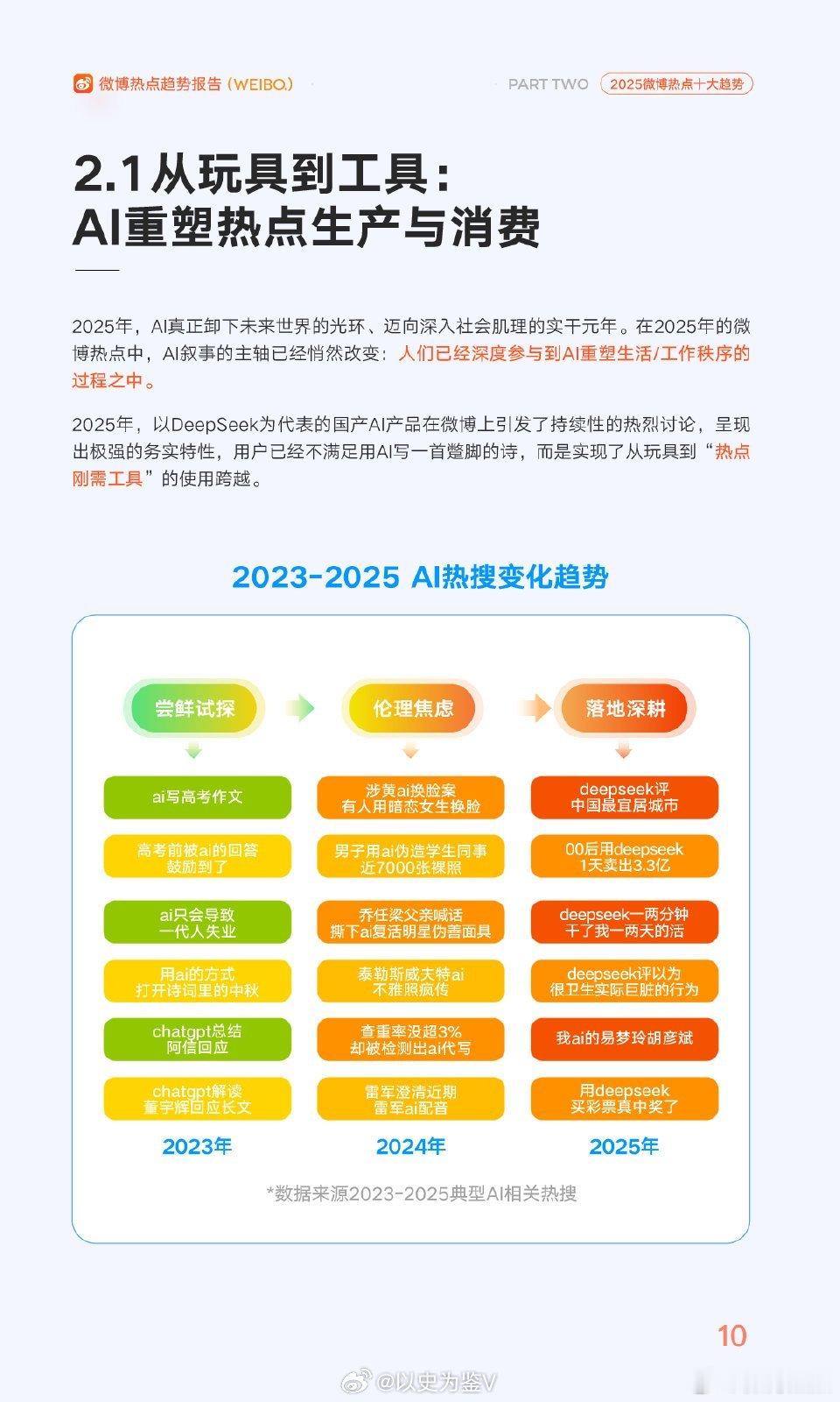 AI如何改变热点的生产和消费作为内容创作者,对于AI的大规模应用其实是心里有数的。有很多mcn前些年就已经通过人工智能大量洗稿,但当时的AI应用还局限在内容创作者这个小圈子里。在2025年,Deepseek的横空出世,一下子让AI普及到了每个互联网用户,而且微博可能是目前最深入拥抱AI的内容平台。经常使用微博的朋友会发现,在过去的一年微博多了一个智搜功能,这个智搜非常好用。以前我看到一个热点话题,但是不知道事件的来龙去脉,以前都需要去专门的吃瓜账号下面去看总结;而现在只需要点开微博智搜,整个事件的来龙去脉,各种媒体大v的观点列的清清楚楚,一目了然。还可以去搜索我看到的某博主,智搜直接总结了ta近期的言论观点,ta的发博垂直方向,是否有争议事件等等……如果遇到不确定的事件,还可以向智搜求助,看看某些事件是真是假?或者某些影视剧片段的原作叫什么名字等等……就我自己的这些使用体验,微博智搜的使用场景还是很广泛。尤其是热点解读,这也是微博智搜最主要的使用场景。刚刚微博公布的2025《微博热点趋势报告》趋势中提到:智搜在热点解读场景中占比达52%,体现用户对热点事件深度分析、背景信息的强烈获取需求;而实时解答以48%的占比成为第二大场景,反映用户借助平台解决即时性信息查询问题的显著需求,产品核心使用价值清晰明确。具体到搜索内容层面,智搜用户消费内容在领域分布、热门关键词及核心特征上呈现鲜明特点:文娱领域以 52% 的占比成为最主要消费领域,用户对明星动态、娱乐事件等需求旺盛,垂直领域(28%,含专业知识、兴趣等)与社会领域(20%,含社会新闻、公共事件等)紧随其后。核心特征可以总结为文娱内容主导、热点驱动明显、实时追踪需求突出。可以说微博智搜推出一年来,已经深刻的影响到了整个微博的用户,大量用户(包括我在内)都很快就习惯了微博智搜。但是根据我的使用经验,我在这里还是要提醒一下大家,微博智搜目前只是AI的一个初级应用,它还存在着很多瑕疵。如果有大量的用户或者大v在某一个观点下面持续输出偏向性的言论,就会对智搜总结的观点形成引导。甚至不乏一些张冠李戴,错误的观念出现。这也对未来的微博用户,提出更高的辨别真伪的能力需求。不管怎么样,人工智能已经彻底的融入到了微博之中,它的高效、便捷也已经被大量的创作者、用户所接受。相信在新的一年,人工智能的应用还会推陈出新,我们要做的是积极的拥抱人工智能,但是要保留自己的最独特的思想,正如报告里所说的——原创的、具有独特视角的深度内容,在AI时代反而更具溢价能力。