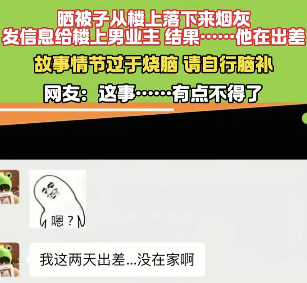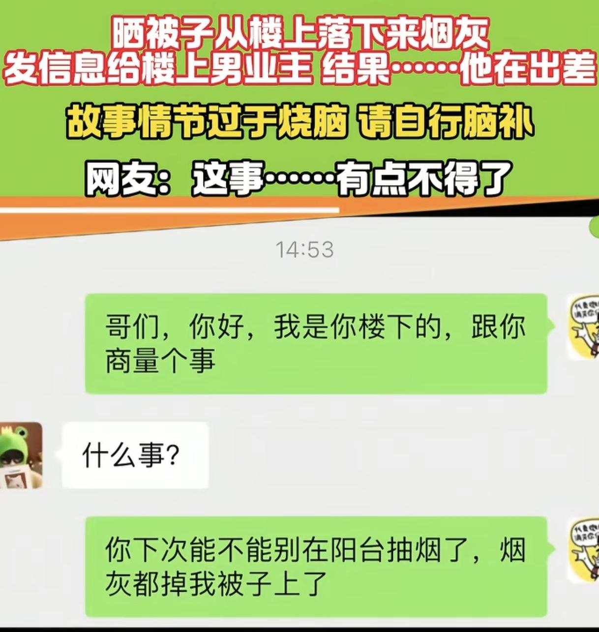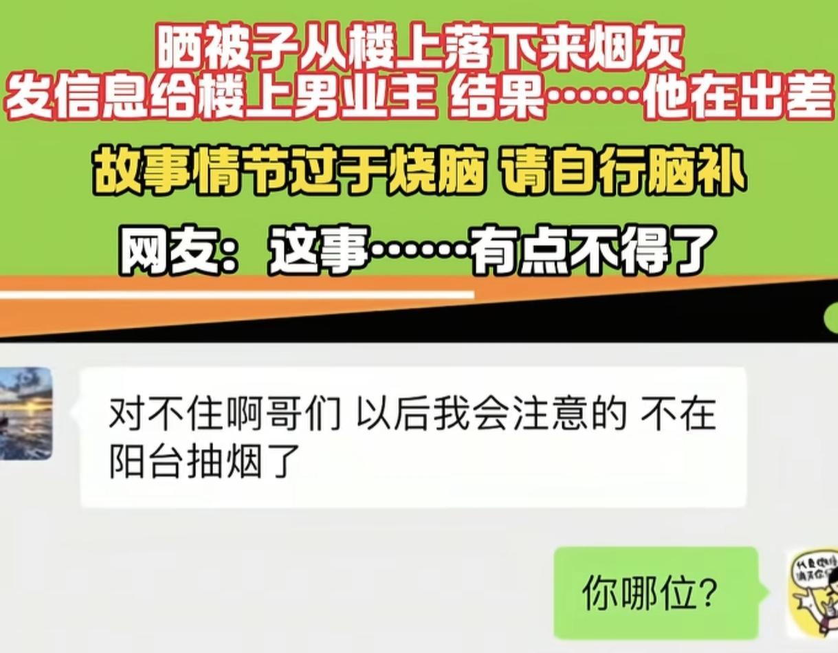 “烧脑又尴尬!” 男子在阳台收被子,发现被子上落了烟灰,就发信息给楼上的男业主提