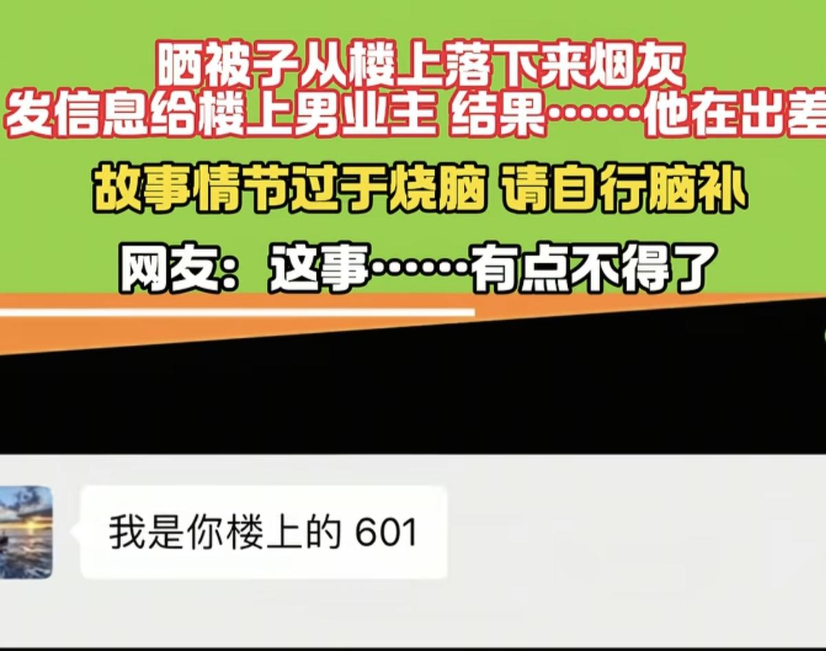 “烧脑又尴尬!” 男子在阳台收被子,发现被子上落了烟灰,就发信息给楼上的男业主提醒他注意一下,没想到对方却说这两天出差没在家,男子很诧异,结果当天晚上楼上就吵得很凶。有意思的是,第二天,601的男业竟主动加男子微信道歉,男子大呼太烧脑并脑补了很多情节与画面。 (来源:河南乡村频道) 这天,阳光很好,男子拿出被子晒,到了下午就打算将被子收回屋,这时他发现被子上落了一撮烟灰,幸好被子没有烧坏。 男子下意识看了看楼上501的阳台,猜测烟灰可能从楼上飘下来的,为避免下次出现类似情况,男子打算上楼提醒一下邻居。 但又觉得此举有些冒失,就拿起手机翻到物业群里,从上到下一通划拉找到501男业主微信后加了对方为好友。 对方很快通过,男子便给对方发去消息:“哥们,你好,我是你楼下的业主,跟你商量个事?” 对方问:“什么事?” 男子直言不讳:“你下次能不能别在阳台抽烟了?烟灰都落我被子上了,你得注意一下哦。” 对方十分诧异:“嗯?......我这两天出差啊,我没在家啊?......” 男子大惊失色,同时也意识到自己可能做错了什么。而对方的感觉也跟男子一样。 果然,晚上,楼上就传来了激烈的吵架声,令男子的心里万分懊悔,大叹:“唉,这件事搞得......”男子原本只是想提醒一下楼上邻居的,也从没想过把事情闹大。 有意思的是,这桩奇葩事件还没有结束~ 第二天,一个名叫“笑谈人生”的微信好友加了男子微信,跟男子道歉:“对不住啊,哥们,以后我会注意的,不在阳台抽烟了。” 男子又诧异了:“你哪位?” 对方回答:“我是你楼上601的。“ 这令男子直呼故事情节太烧脑了,顿时脑子里又自行脑补出很多画面,明显懂的都懂啊。 网友们看后,纷纷当起了“福尔摩斯”。 有网友说:“很简单,601男主趁501男主不在去他家了,事后在阳台抽烟落灰在401被子上,最终501男主回来跟老婆吵架了。” 也有网友看热闹不嫌事大,说:“这哥们做法欠妥啊,你应该直接在物业群里大喊一声不就得了,这样避免误伤啊。” 还有网友说:“这下证据链完整了,601男主在501阳台抽烟,被401男主破了案。这男子太不厚道了,拆了501,曝光了601,看破不能说破,结果彻底捅破!” 更有网友分享说:“我有一天发现家里飘进了很多撕碎的书和试卷,还有辣条袋子,就带着证据就找到楼上的人。刚下楼就听到了楼上的惨叫声,打得哇哇叫......” 这件邻里之间的故事太烧脑,也很有趣。男子本能醒楼上邻居的,没想到让他发现了对方家里的隐情,之后又有邻居出来道歉,更让这件事充满了尴尬。 都说,三个女人一台戏,我看,三个男人更有戏。这件事中四楼男子就是一脸懵的吃瓜侦探,出差的男主成为被意外戳破隐情的暴躁当事人,而楼上抽烟的男子则是全是隐身的“始作俑者”。三人没正面碰面,全靠“烟灰”串起一出反转戏,主打一个全员在线又各演各的,真是一出精彩好戏。 对于这件事,大家怎么看待呢?