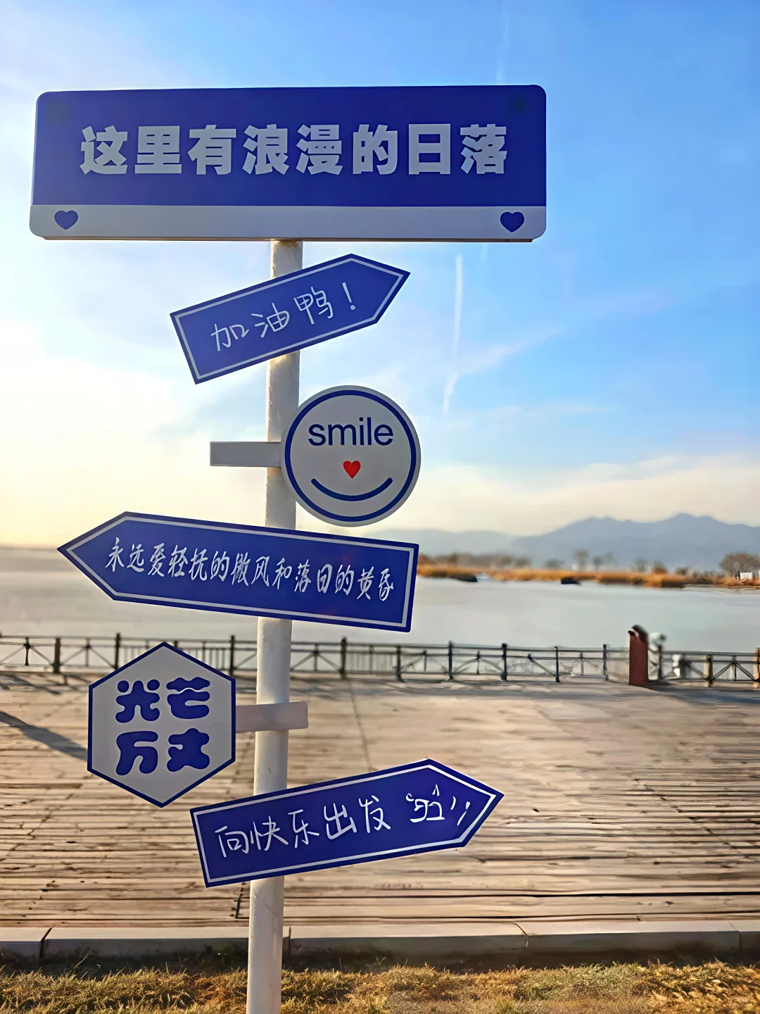 ✅ 指路牌也别错过!蓝白箭头搭配"保持微笑😊"的标语,随手一拍就是日系小清新📸