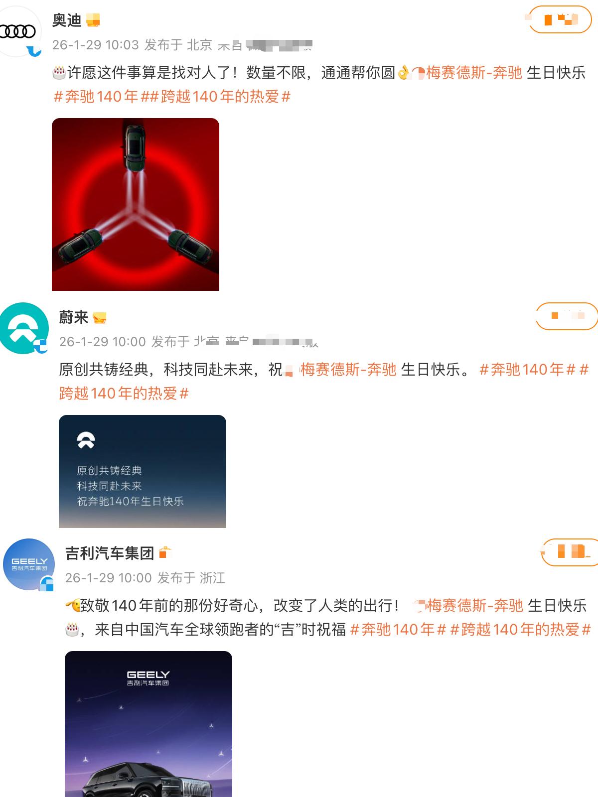 这就是车圈老大哥的声望?奔驰140岁生日,一大票车企送来祝福,包括老对手宝马奥迪,还有小米、鸿蒙智行、理想、蔚来一众新势力,另外吉利、沃尔沃、凯迪拉克、别克也送上了祝福。 当然了,还有无动于衷的[灵光一闪]比如特斯拉、大众、现代起亚、本田、丰田、日产、雷克萨斯都没动静[捂脸]看来和奔驰关系不太好?[尬笑]