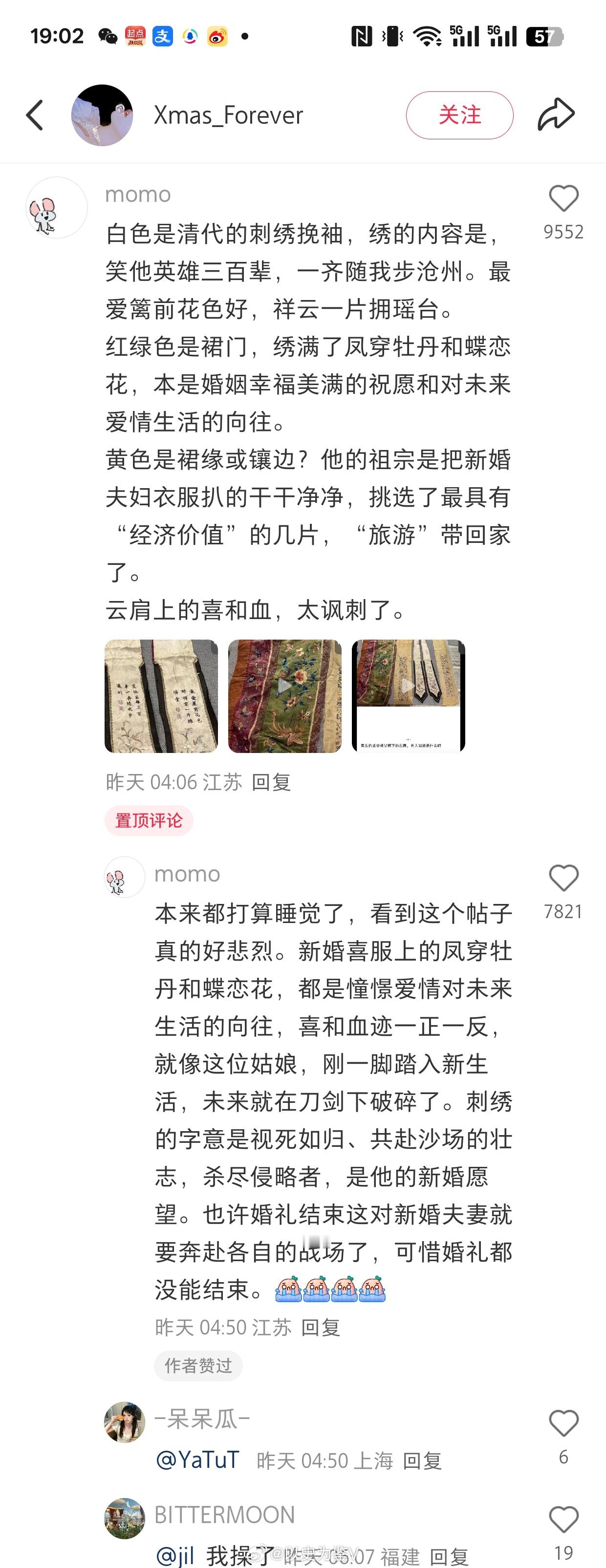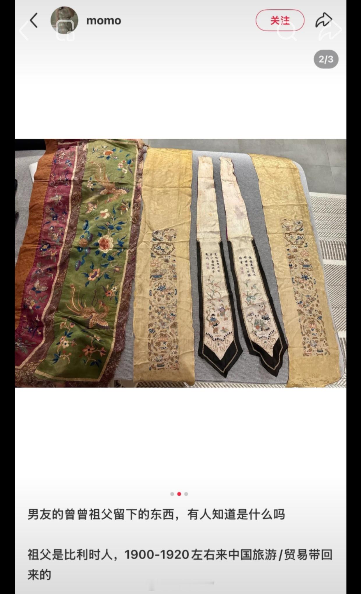 一个小红书女博主发帖炫耀她的比利时男朋友的曾曾祖父留下的东西,说是1900-1920年从中国带回去的。结果被网友认出这是清代大婚时的喜服,上面还有斑斑血迹……网友已经脑补出这可能是当时大户人家的新人结婚,没想到被比利时军队突入婚礼现场,杀害新人,从新人身上拔下带血的婚服配件当做战利品带回比利时……没想到一百多年后,凶手后代的女朋友却在中国互联网拿着带血的婚服发问:这是什么东西?这是一百年前中国人的血泪!是凶手烧杀抢掠的证据!是永远铭记在中国人心里的来时路!PS:图九考证的诗句应该是“笑他英雄三百辈,一起随我步瀛洲”