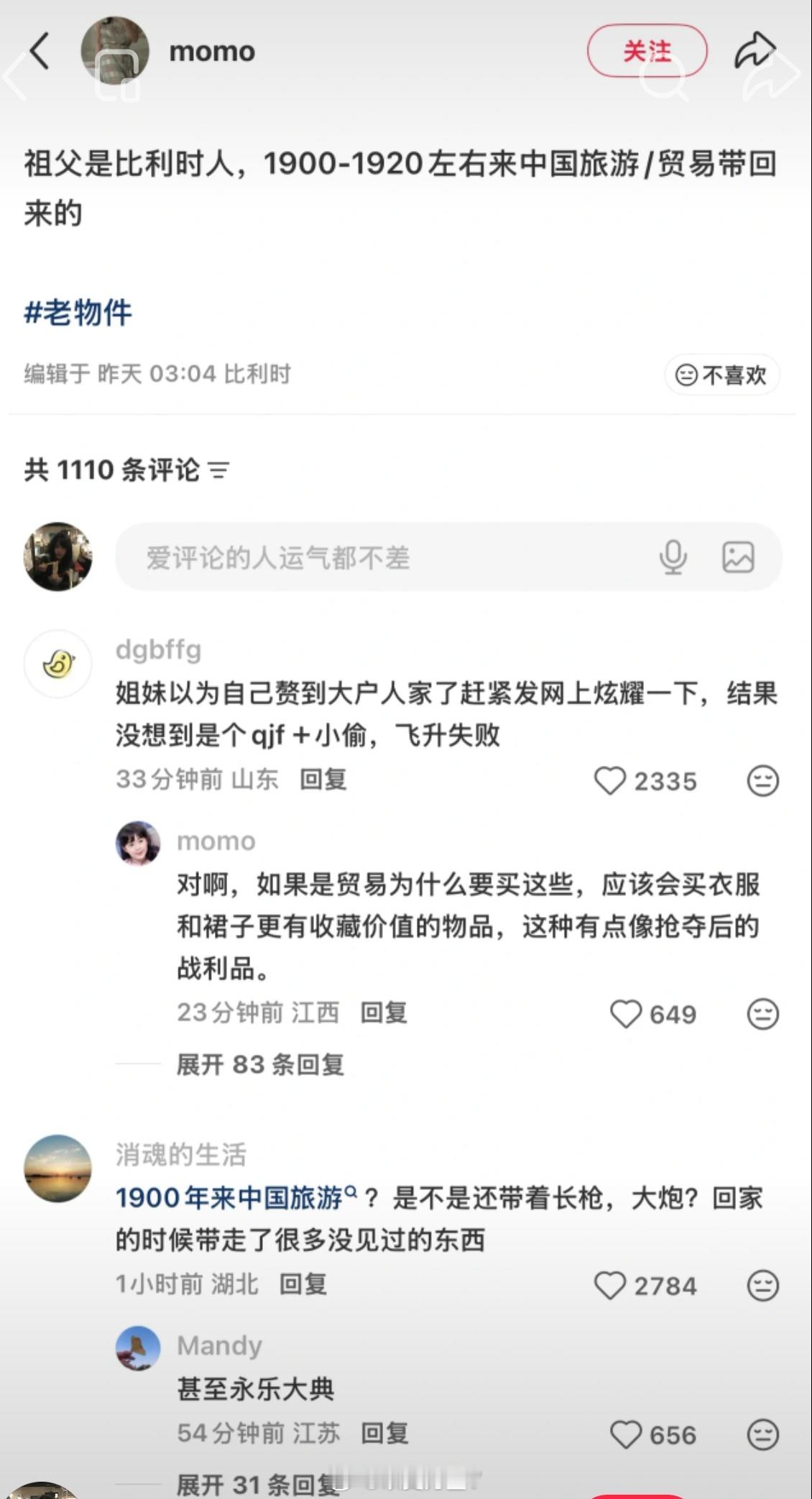 一个小红书女博主发帖炫耀她的比利时男朋友的曾曾祖父留下的东西,说是1900-19