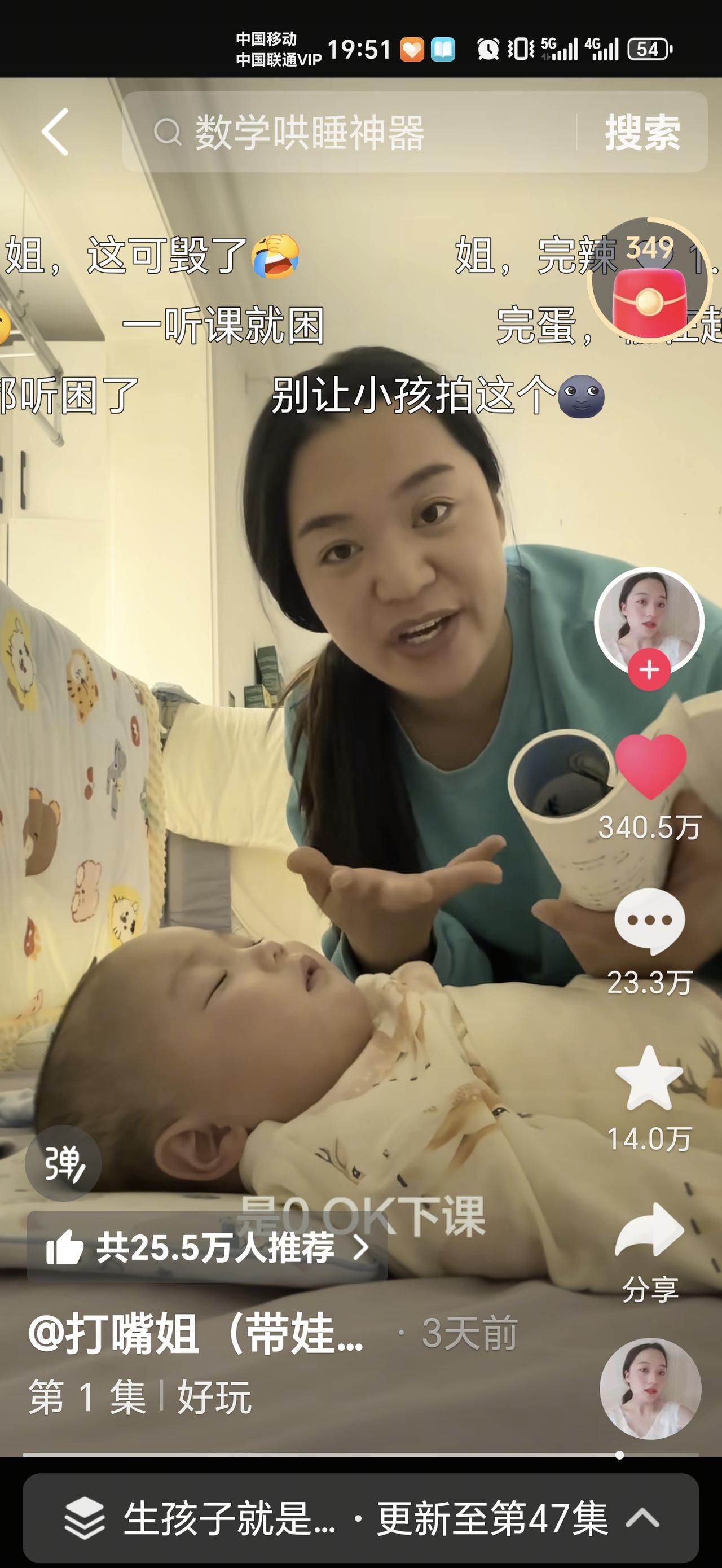 真是奇葩的育儿经!你见过哄几个月的宝宝睡觉的方法是讲数学课吗? 今天刷到一个视频,宝妈哄宝宝睡觉的方法,就是一手轻轻拍宝宝,一手拿课本讲正数、负数、0的平方根是多少,为什么。 嗨!你别说还怪有效呢,课讲完了,宝宝也睡熟了[捂脸][捂脸][捂脸] 看弹幕上的评论说什么的都有。有的说“完了,要输在起跑线上了”;有的说“宝宝,这辈子的童年就这么短吗”;还有的说“学渣一个”。。。 不管怎么说,这个短视频的流量可好大啊!点赞都340.5万了,评论也达到了23.3万。 祝愿这个宝宝将来长大能够成为学霸[赞][赞][赞]