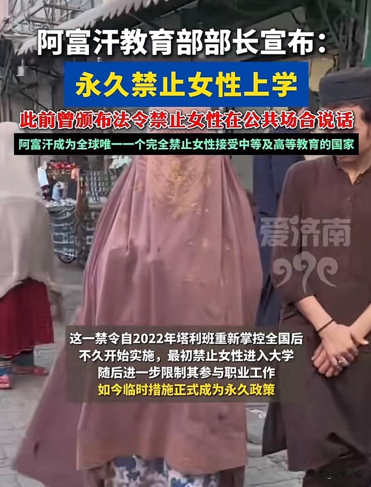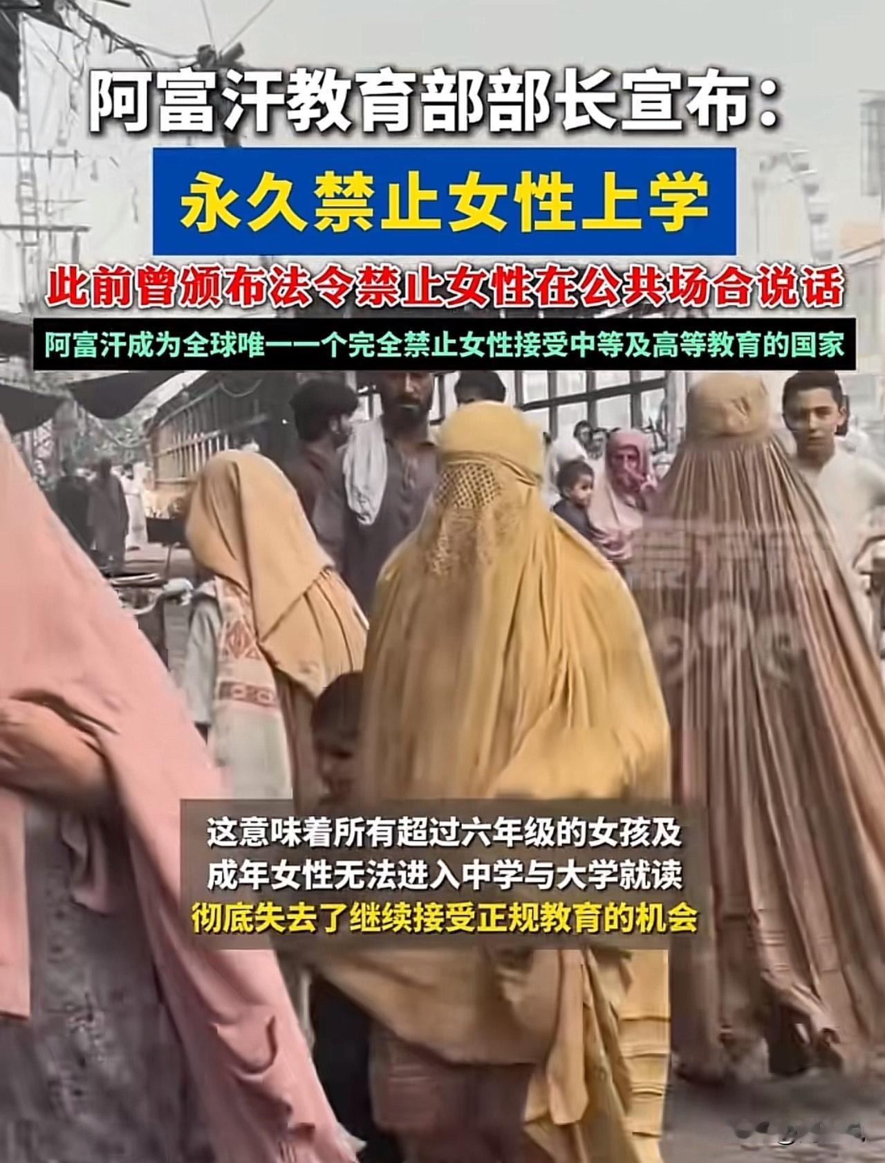 太奇葩了!真是万万没想到,已经二十一世纪了,阿富汗教育部部长竟然宣布:永久禁止女性上学,这意味着所有超过六年级的女孩及成年女性无法进入中学与大学就读,彻底失去了继续接受正规教育的机会。 而这一奇葩规定,也意味着阿富汗成为全球唯一一个完全禁止女性接受中等及高等教育的国家。 这一个禁令真的让人搞不懂啊,真的不解,生在这个国家的女性简直太可怜了。这事看来,投胎也是个技术活,庆幸我们都生在中国,长在中国,祖国万岁…..#寻美三湘# #长沙新朋友#