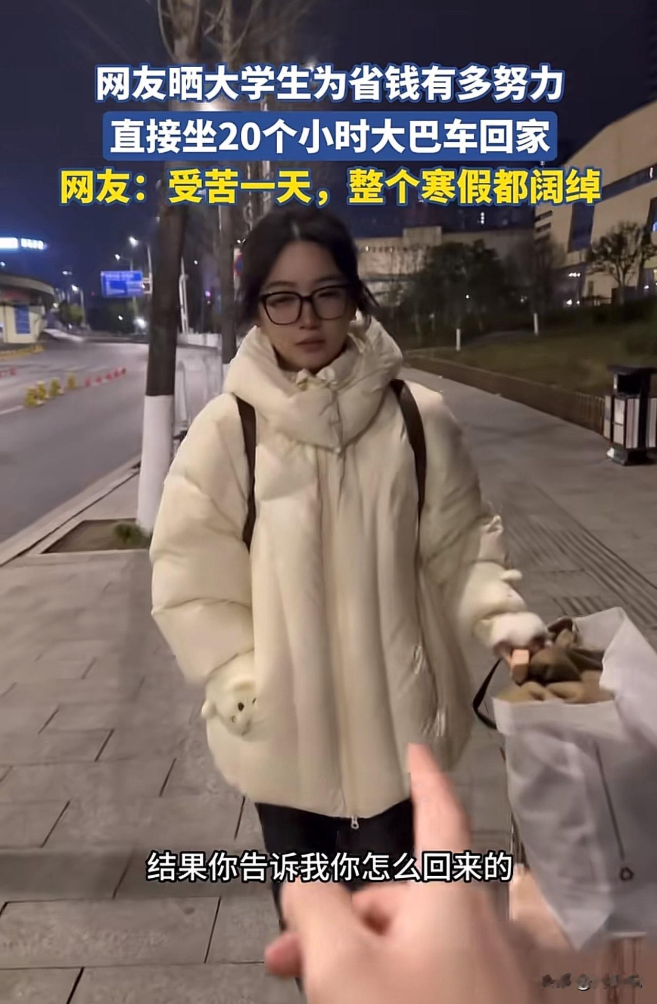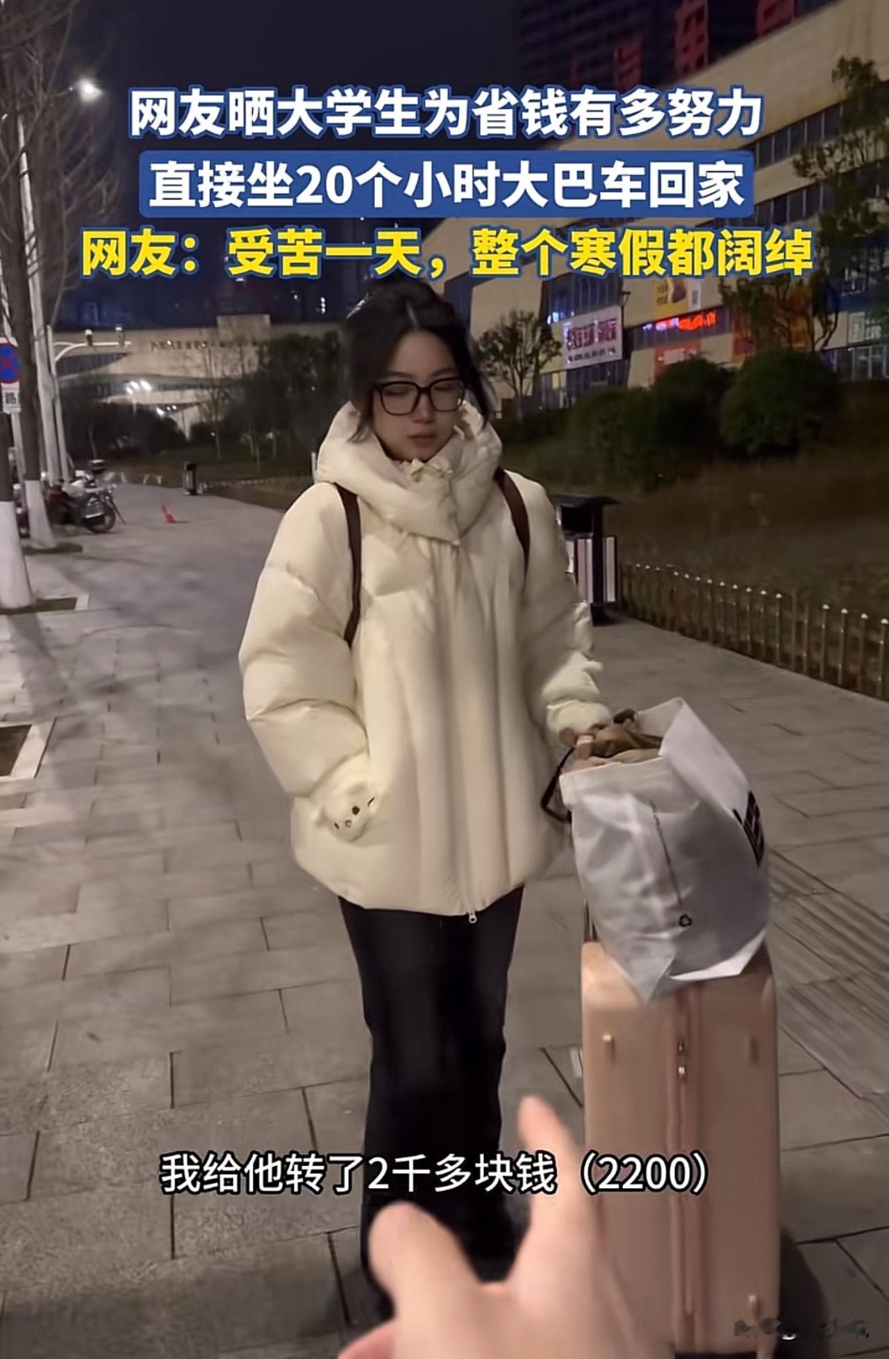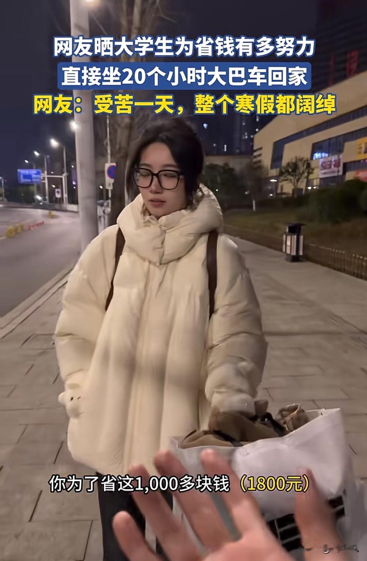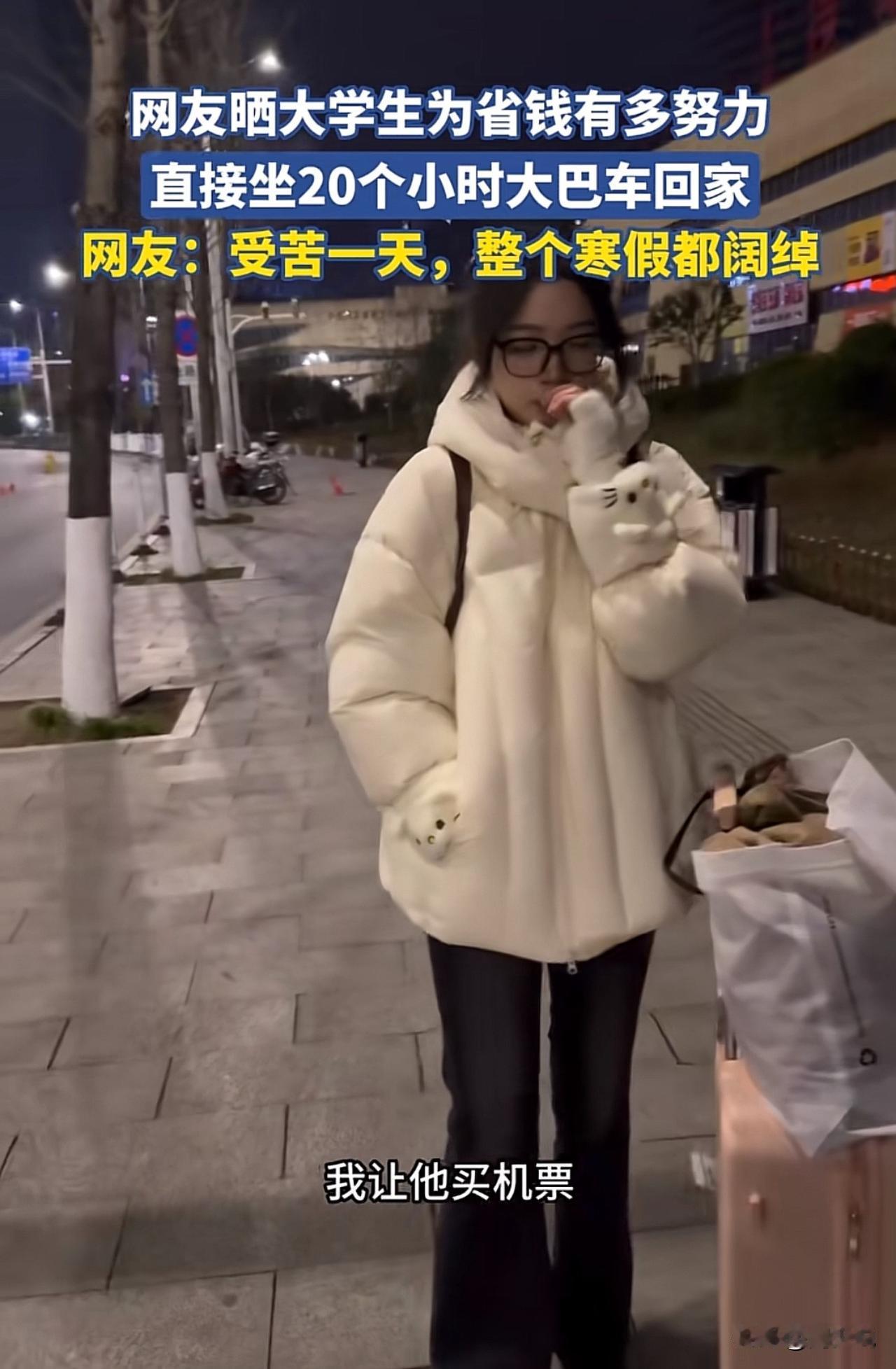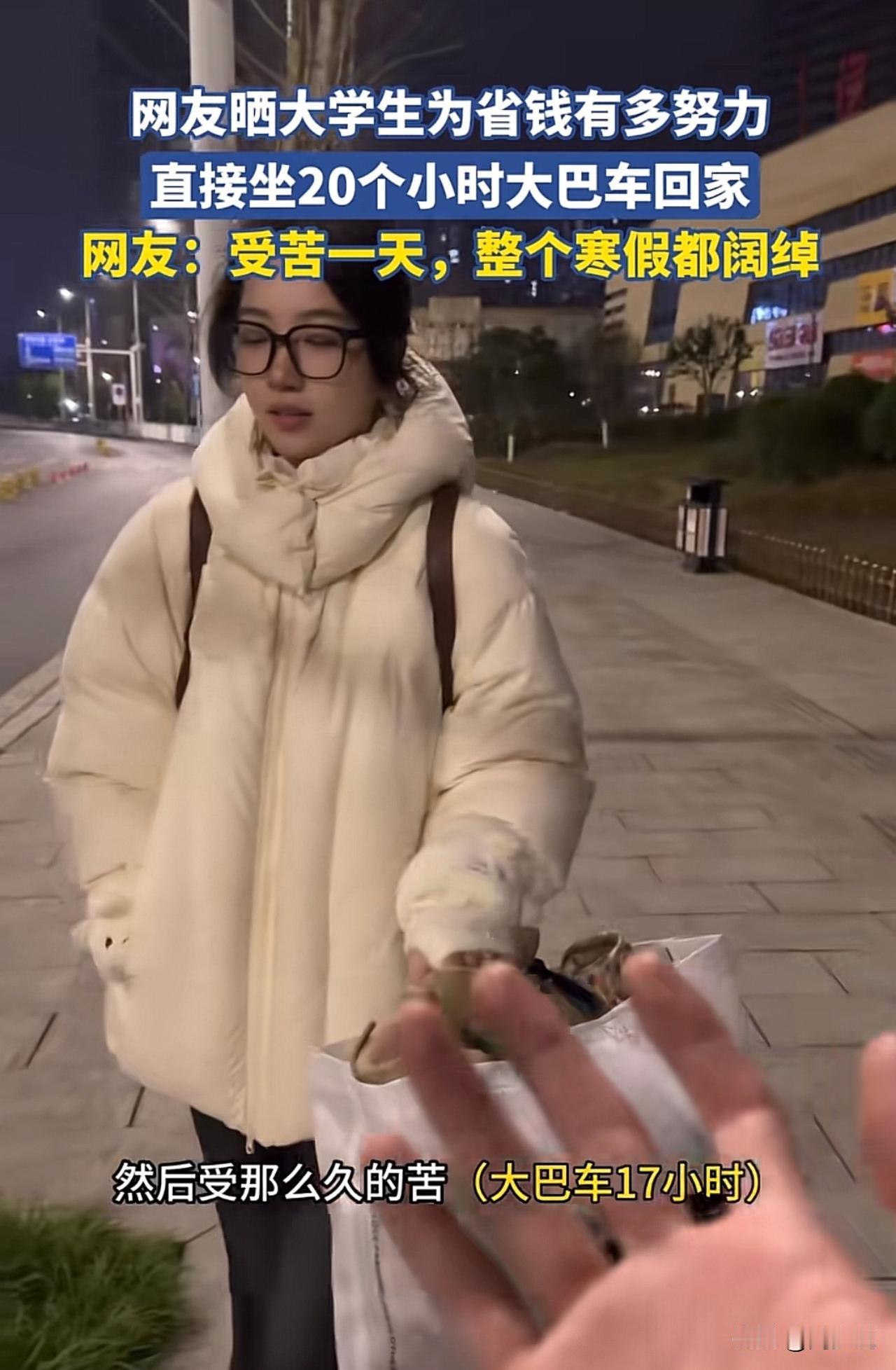 “佩服现在的女大学生啊!”一位家长发视频吐槽,自己给放假的女儿转了两千多块钱买机票,女儿却为了省下1800元,硬生生坐了17个小时大巴回了家,这一幕让家长又心疼又崩溃。 视频一出,网友们也炸开了锅。有人说这姑娘太懂事,知道体谅父母赚钱不易,这样的孩子将来肯定差不了。 也有人觉得没必要,17个小时的车程,舟车劳顿不说,也容易耽误时间,稍微对自己好点也没啥。 在周少看来,这位女生的选择,恰恰暴露了当下大学生的选择。她省下的不只是1800块钱,更是一份藏在骨子里的体谅与懂事。 现在不少年轻人,花钱大手大脚惯了,能主动为父母着想、愿意为省钱吃苦的,真的不算多。 从另一个角度来说,这趟17个小时的车程,更像是一堂生动的成长课。它教会我们的,不只是勤俭节约的道理,更是换位思考的能力。 当然,也有人会觉得,偶尔对自己“奢侈”一次也未尝不可,毕竟身体的舒适也很重要。但不管怎么说,这位女生的这份心意,真的值得我们点个赞。#寻美三湘# #长沙新朋友#