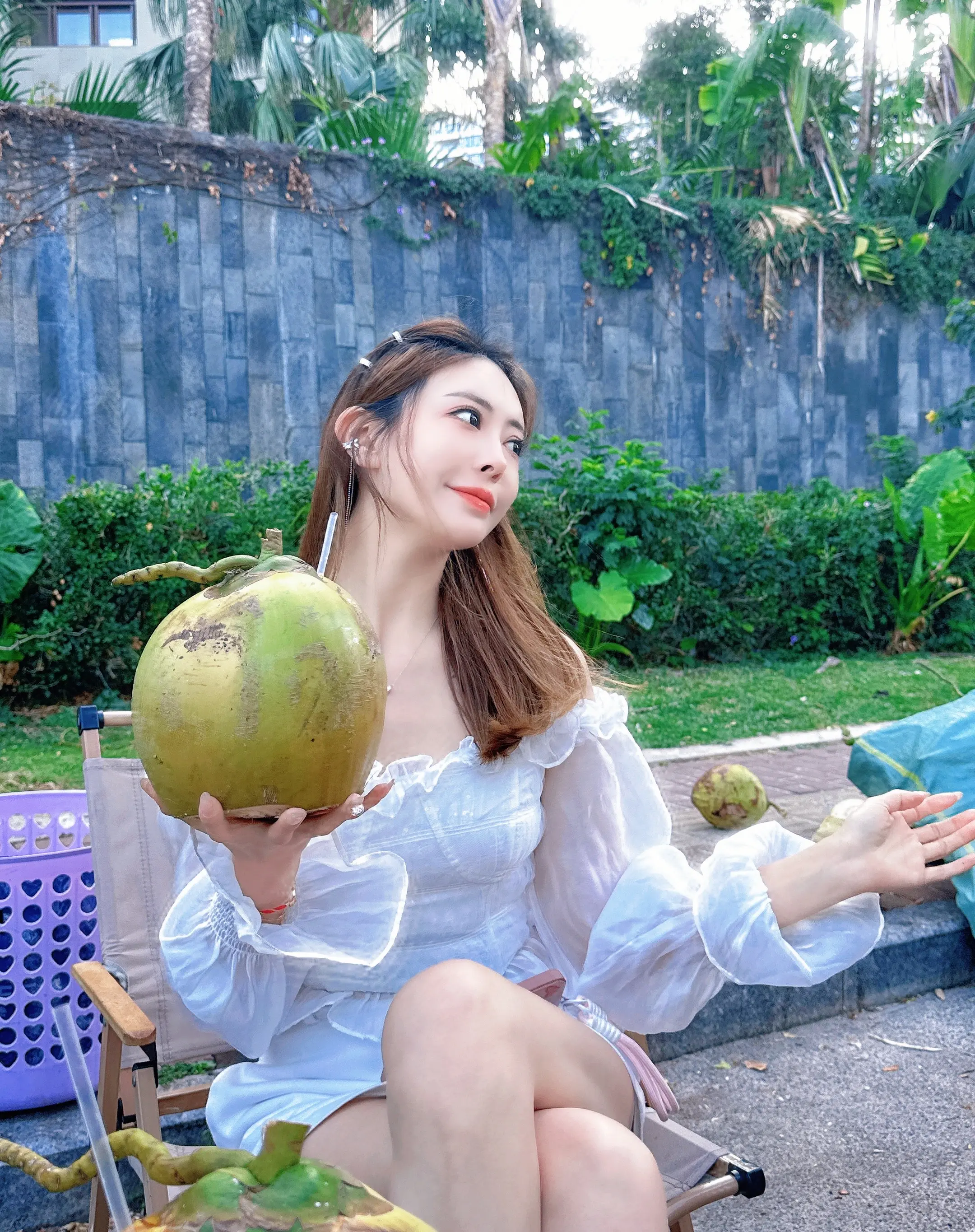 椰叶裁云覆浅塘,素衣漫惹草痕长。垂眸时握檐边帽,抬眼初惊鬓畔光。