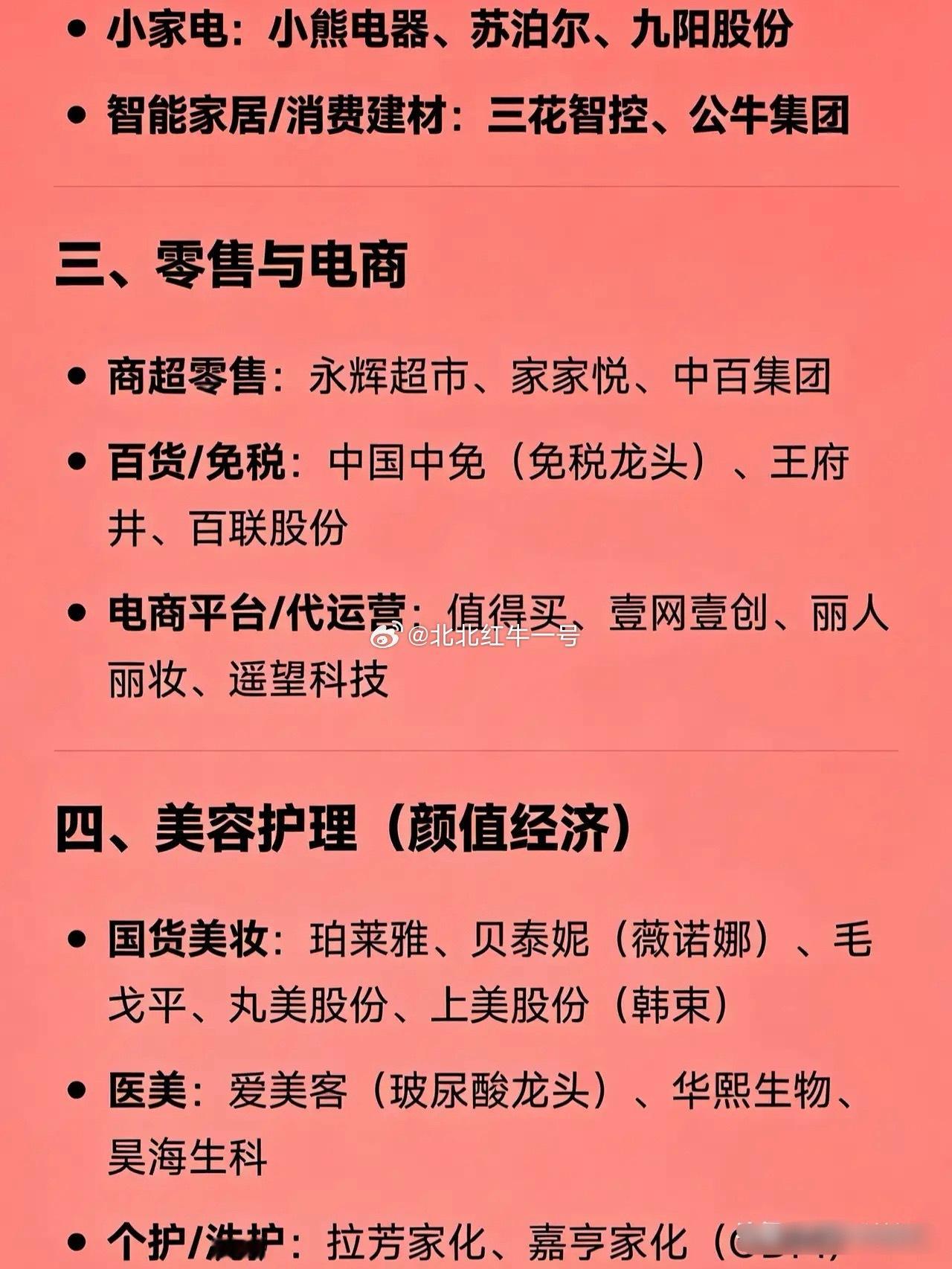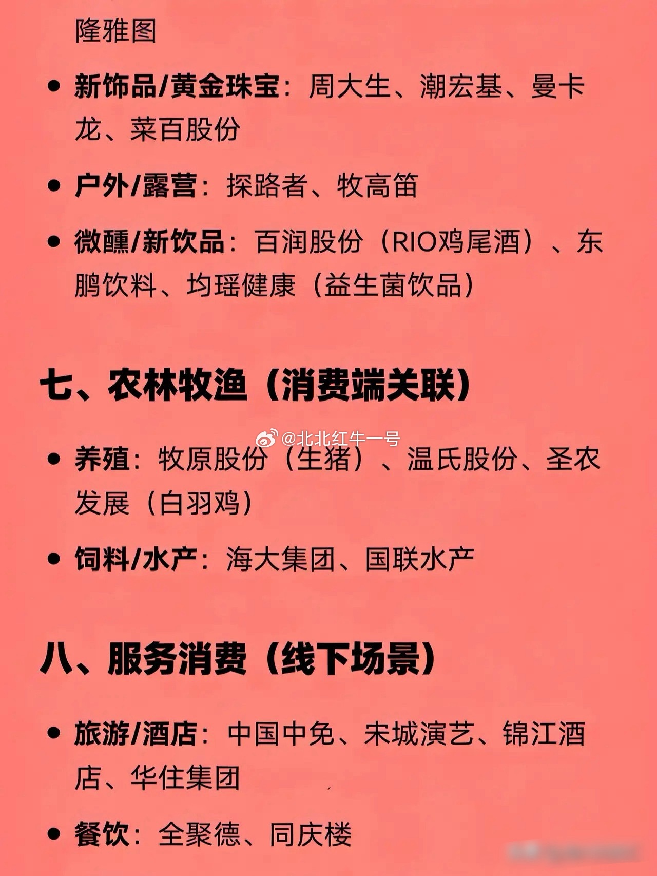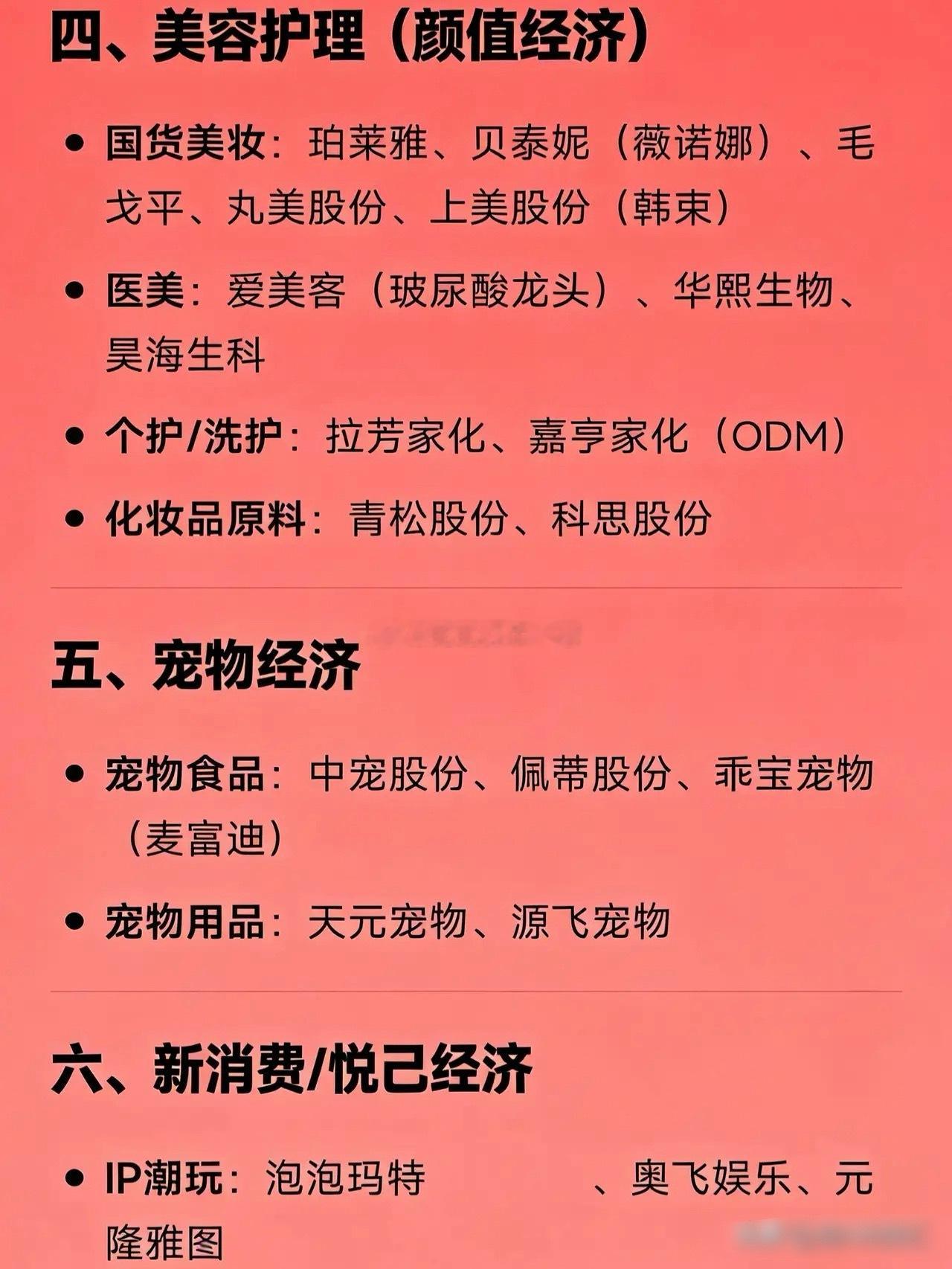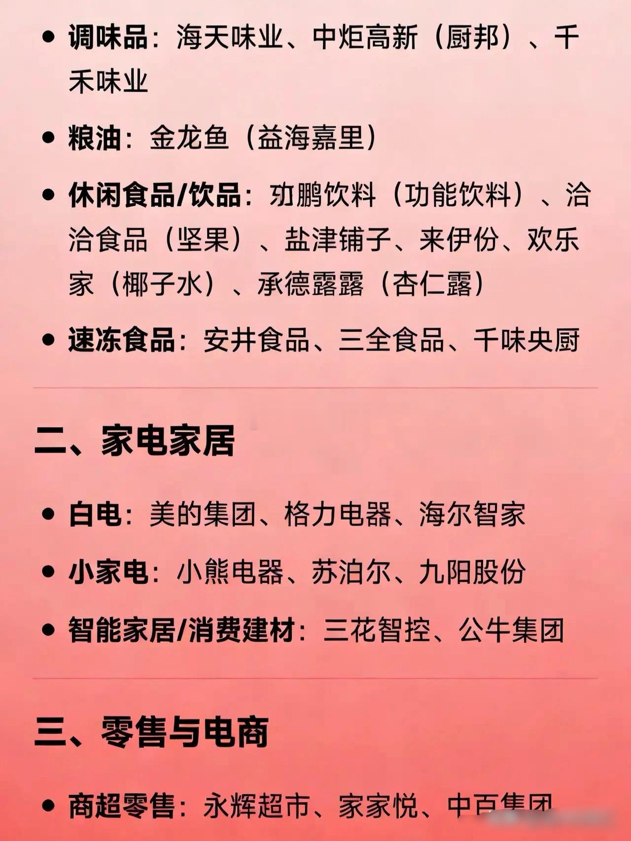 大消费概念相关企业的龙头分类汇总一、食品饮料白酒:贵州茅台、五粮液、山西汾酒、泸州老窖、洋河股份、古井贡酒、酒鬼酒、舍得酒业啤酒:青岛啤酒、燕京啤酒(未列但属传统龙头)、精酿代表:乐惠国际黄酒:古越龙山、会稽山、金枫酒业乳业/奶粉:伊利股份、光明乳业、新乳业、妙可蓝多(奶酪)、三元股份、西部牧业调味品:海天味业、中炬高新(厨邦)、千禾味业粮油:金龙鱼(益海嘉里)休闲食品/饮品:东鹏饮料(功能饮料)、洽洽食品(坚果)、盐津铺子、来伊份、欢乐家(椰子水)、承德露露(杏仁露)速冻食品:安井食品、三全食品、千味央厨 二、家电家居白电:美的集团、格力电器、海尔智家小家电:小熊电器、苏泊尔、九阳股份智能家居/消费建材:三花智控、公牛集团 三、零售与电商商超零售:永辉超市、家家悦、中百集团百货/免税:中国中免(免税龙头)、王府井、百联股份电商平台/代运营:值得买、壹网壹创、丽人丽妆、遥望科技 四、美容护理(颜值经济)国货美妆:珀莱雅、贝泰妮(薇诺娜)、毛戈平、丸美股份、上美股份(韩束)医美:爱美客(玻尿酸龙头)、华熙生物、昊海生科个护/洗护:拉芳家化、嘉亨家化(ODM)化妆品原料:青松股份、科思股份 五、宠物经济宠物食品:中宠股份、佩蒂股份、乖宝宠物(麦富迪)宠物用品:天元宠物、源飞宠物 六、新消费/悦己经济IP潮玩:泡泡玛特、奥飞娱乐、元隆雅图新饰品/黄金珠宝:周大生、潮宏基、曼卡龙、菜百股份户外/露营:探路者、牧高笛微醺/新饮品:百润股份(RIO鸡尾酒)、东鹏饮料、均瑶健康(益生菌饮品) 七、农林牧渔(消费端关联)养殖:牧原股份(生猪)、温氏股份、圣农发展(白羽鸡)饲料/水产:海大集团、国联水产 八、服务消费(线下场景)旅游/酒店:中国中免、宋城演艺、锦江酒店、华住集团餐饮:全聚德、同庆楼医疗/养老:爱尔眼科、通策医疗、鱼跃医疗