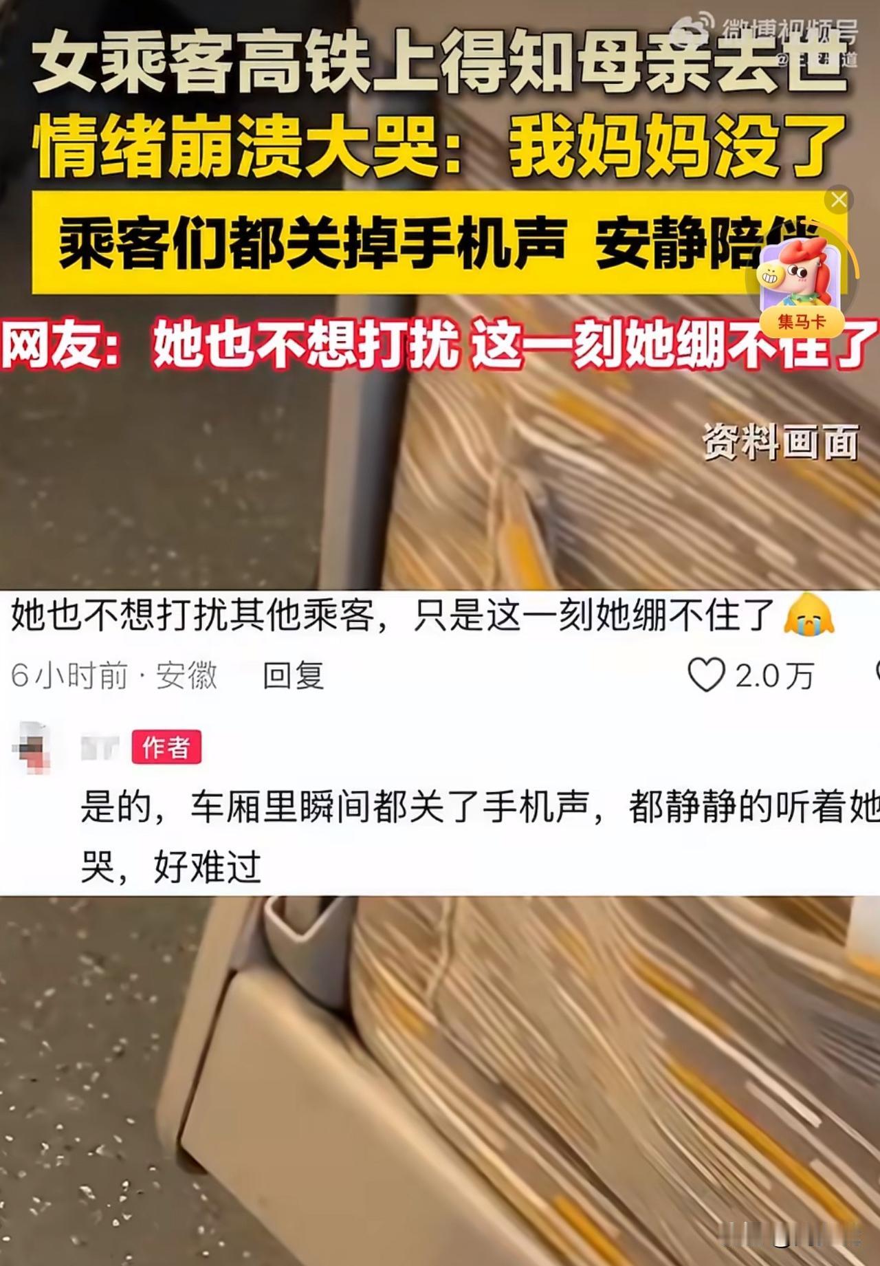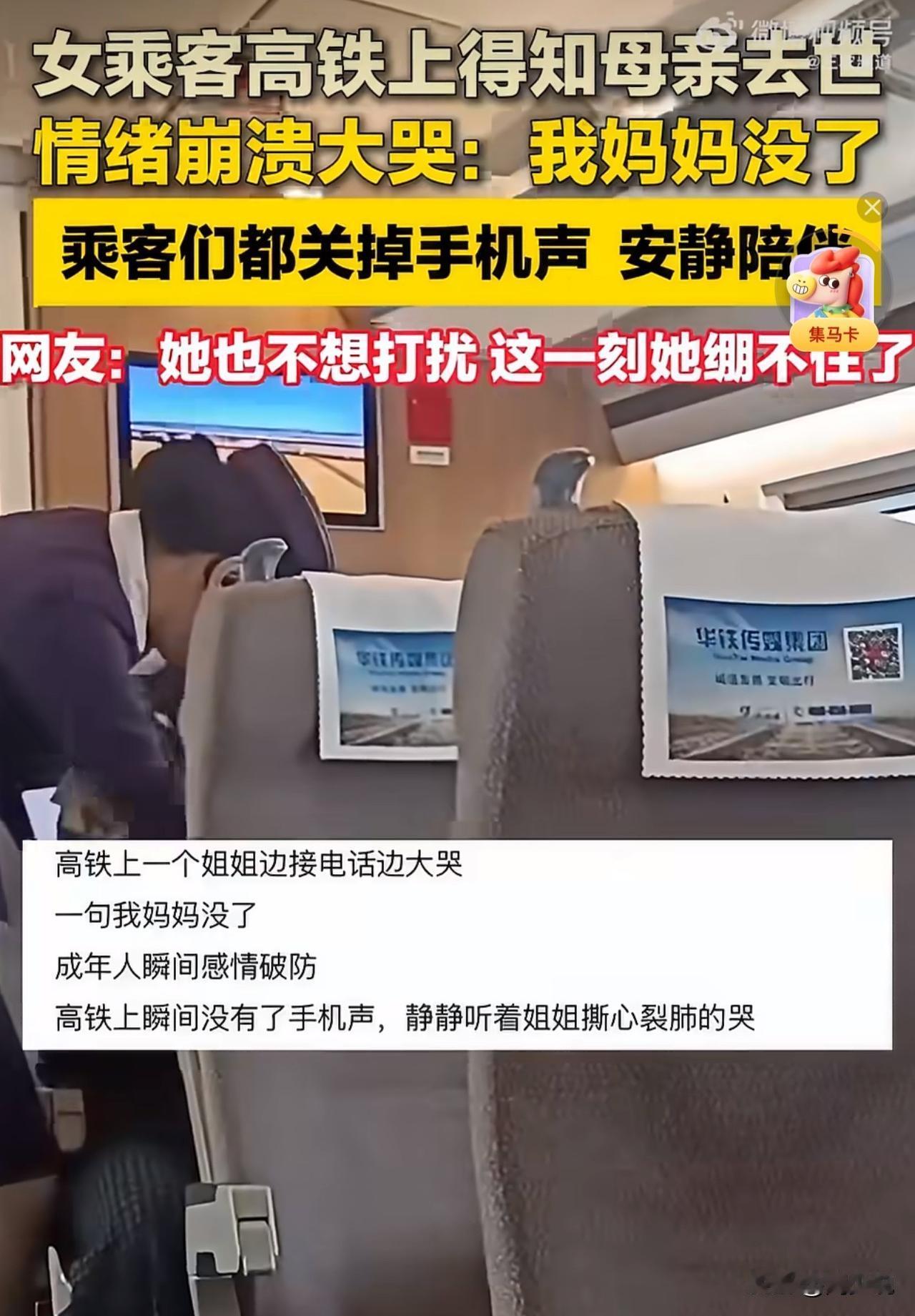 “泪目!”安徽高铁上一名女乘客接起电话,话音刚落,整个人就瘫坐在座位上,崩溃大哭喊着“我妈妈没了”,让在场所有乘客都破防。让人暖心的是,满车厢的乘客没有一句抱怨,反而纷纷关掉手机声音,静静陪着她。列车工作人员也快步上前,轻声递上纸巾安抚。 这一幕,被乘客拍下后发到社交平台,网友们纷纷共情,“她一定是赶回家,却没见到最后一面“! 也有的说:“她当时得多无助啊,连崩溃都怕打扰别人”! 周少想说这一幕没有惊天动地的举动,却藏着最动人的温柔。我们或许都有过猝不及防的崩溃时刻,而身边人的沉默陪伴,往往比千言万语更有力量。 这份来自陌生人的体谅,算不上什么大事,却能让人在冰冷的悲伤里,触到一丝人间的暖意。这种无声的善意,不是刻意为之的表演,更像是一种本能的共情,也让我们明白,人间的美好,从来都藏在这些不经意的瞬间里。#寻美三湘# #长沙新朋友#