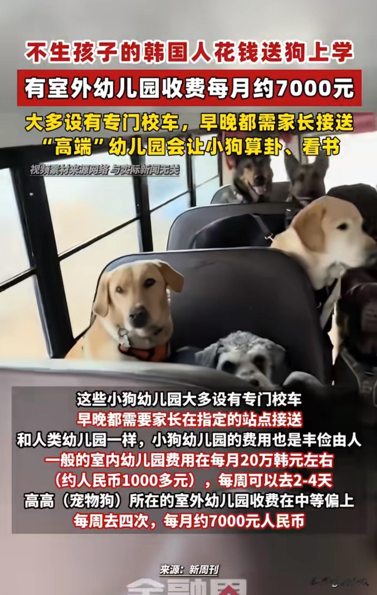 “韩国这波操作真的太颠覆认知!”据媒体报道,不生孩子的韩国人竟然花钱送狗上学,给宠物狗报“贵族幼儿园”,每月学费高达7000元,还有专属校车接送,高端机构甚至开设“算卦”“看书”这类特殊课程。 这事儿曝光后引发不少热议,有网友调侃:“现在的狗过得比人还精致,我上学都没这待遇”。 也有人直言:“把对孩子的精力花在狗身上,多少有点本末倒置! 说实话,韩国人这波操作确实太颠覆认知。更离谱的是,据知情人透露,在韩国很多公共场所,小孩子都被禁止进入,而宠物却可以。只能说,韩国人真的会玩,佩服!#寻美三湘# #长沙新朋友#