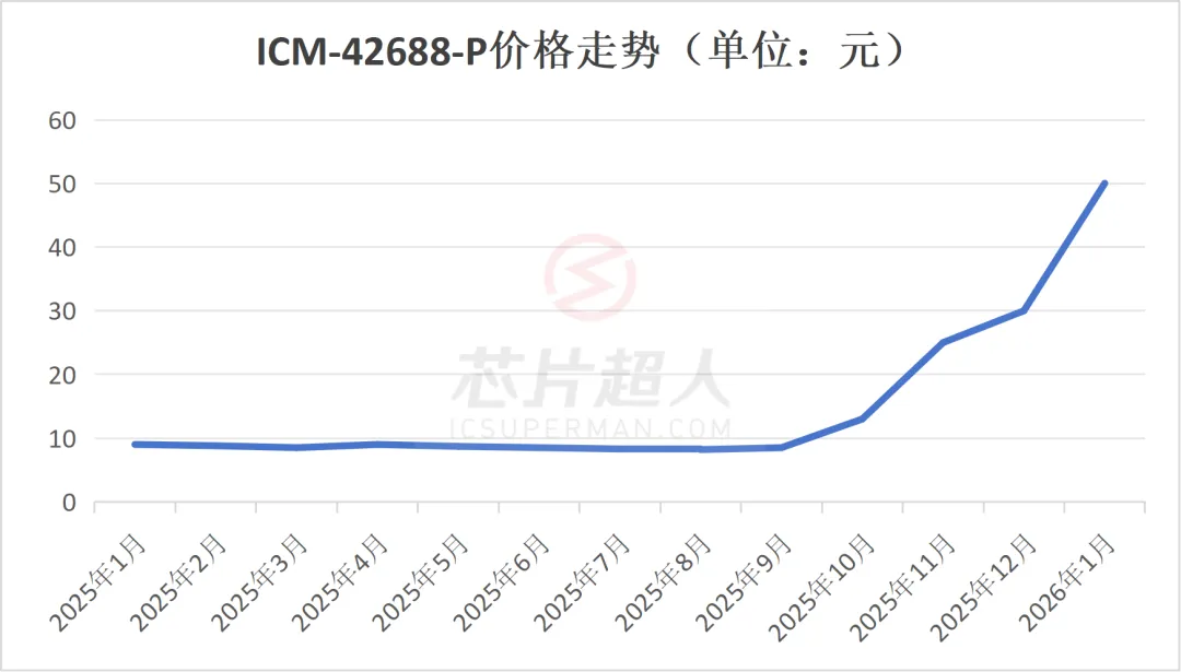 ICM-42688-P热度飙升,价格从上月的30元左右涨至50-60元左右,部分报价飙升至70元以上;ICM-42670-P常态价格在5-6元,本月也迎来了涨价,报价在15-16元左右。