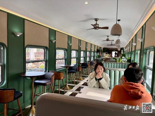 一节绿皮车厢被改造成“武昌北1917”咖啡厅,上下推拉的火车车窗带人穿越时光。父辈曾在铁路工作的张女士,一边喝咖啡一边给孩子讲着铁路文化。