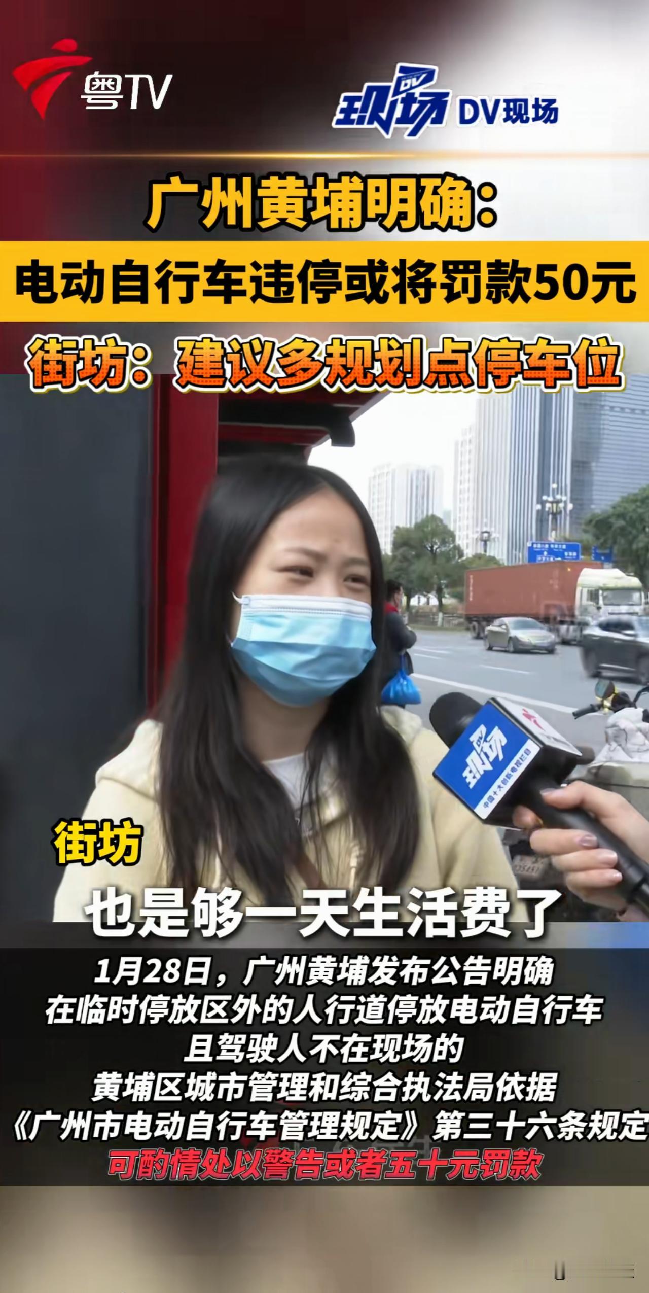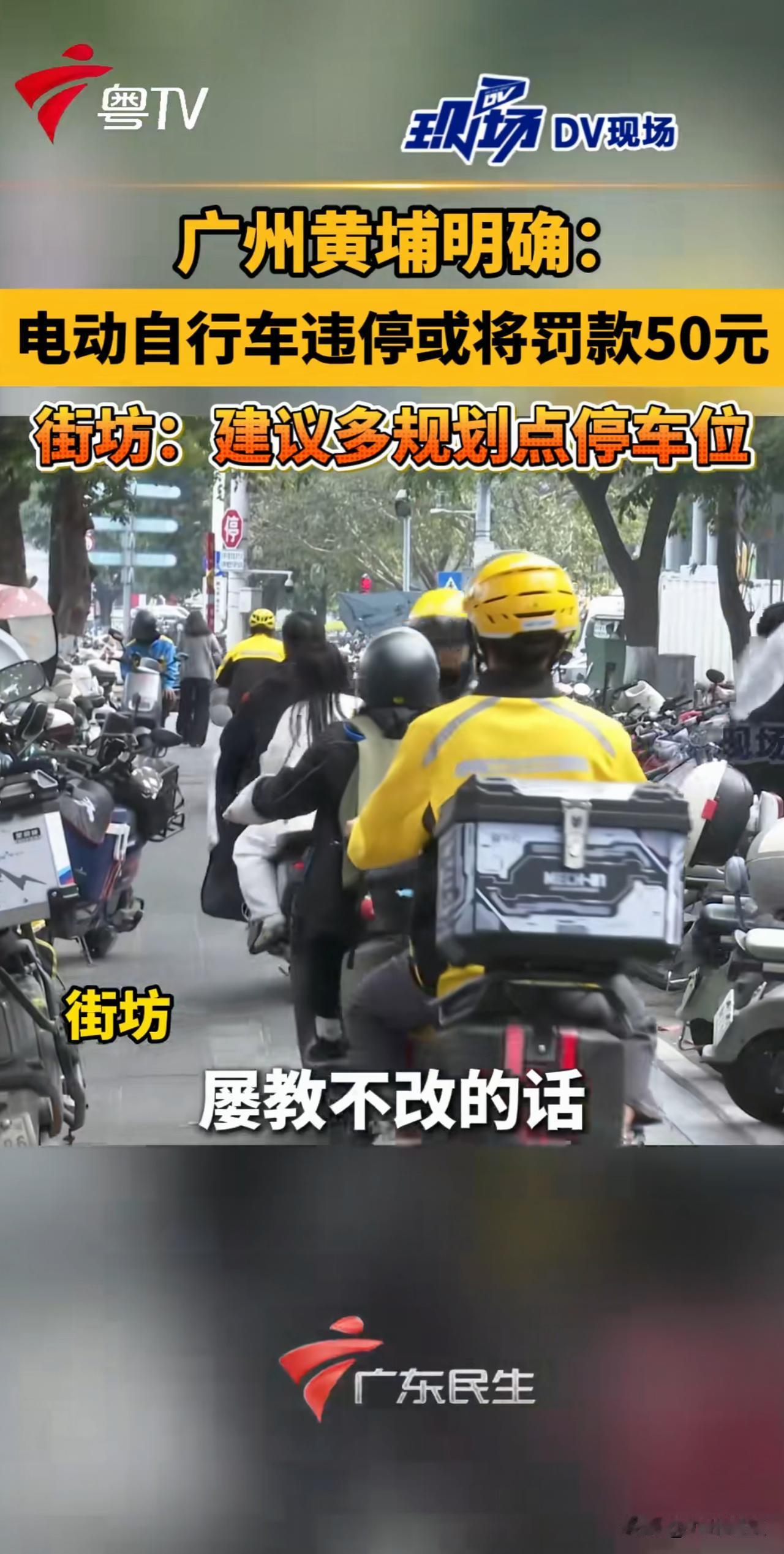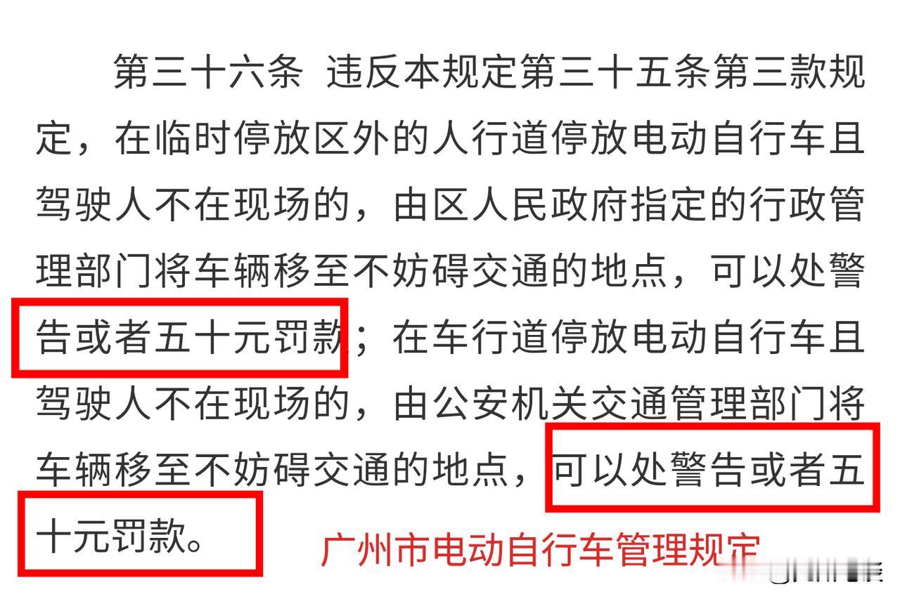 广州数百万电鸡车主瑟瑟发抖,整治乱停乱放的大招已来,黄埔区已经打响电鸡违停罚款第一枪,广州其他区,尤其核心区会跟进吗? 电动自行车在非停放区域停放的,罚款50元!这是有依据的,《广州市电动自行车管理规定》第三十六条就是这样规定的。 现在广州电动自行车主要停放在人行道上两侧,一般是靠边停放,给行人留出一定的空间。但有些电鸡佬乱停乱放,堵住行人通道,甚至放在盲道上,人行横道前面,导致行人无法正常通行。 规范停放是需要的,电鸡驾驶人不能只方便自己,影响他人。 首次警告,然后再违停就罚款50元 。 50元说多不多,说少不少,正如街坊说的,50元都够一个人一天的生活费了。 如果是我,50元一天吃饭都用不了,早餐五元左右,中午晚上各15元左右,只是吃饭的话,工作日一天只需要40元不到。 为了避免荷包损失,还是要尽量找画线的地方停放。即使画线的地方停满了,也不要停放在路口盲道等影响通行的地方。 当然了,还要避免停放在停车区的车辆被人为搬出来,最好自己停好后拍张照,一旦被被人搬出来违停被罚款,也有照片为证。 与人方便自己方便。