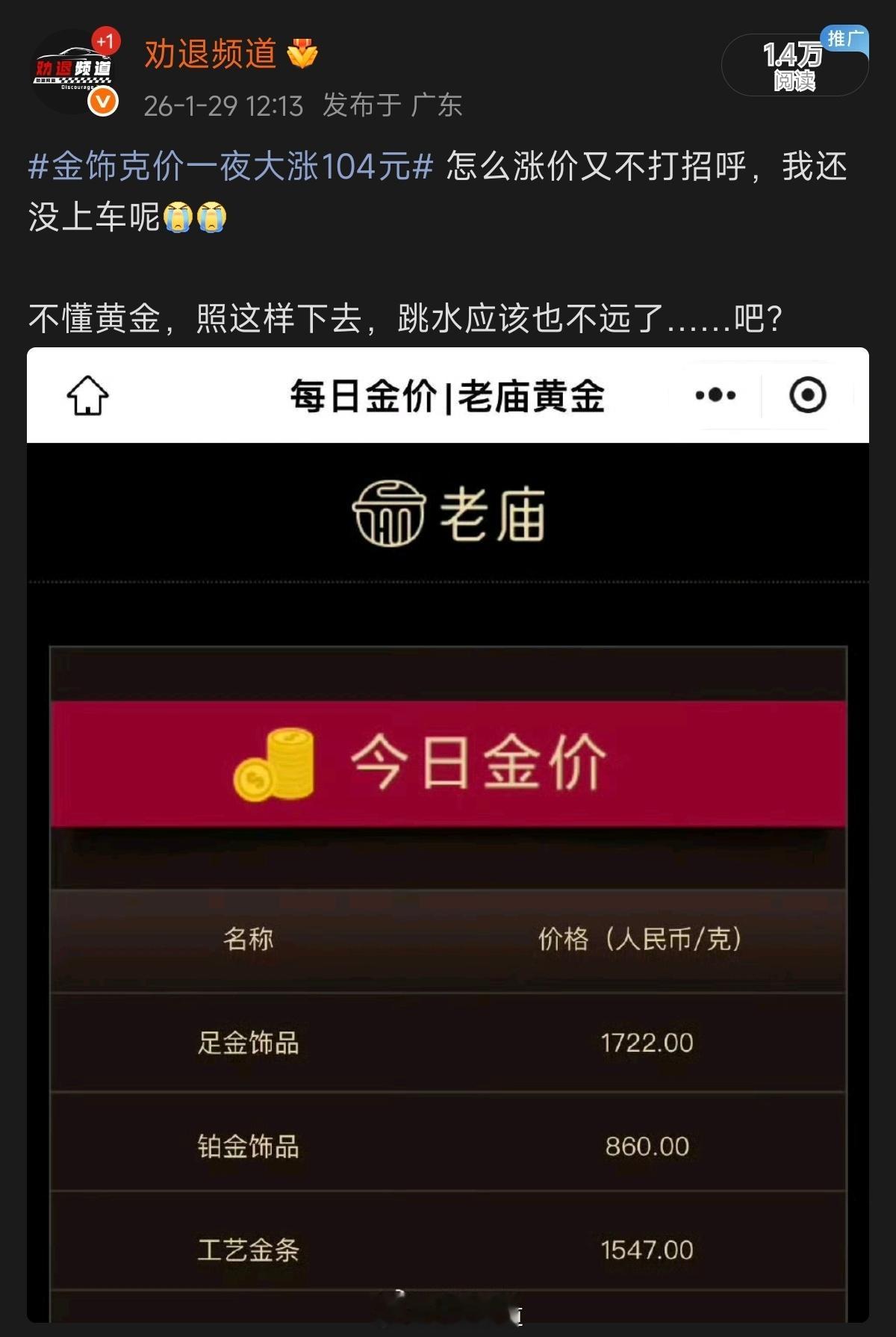 金饰克价跌回1662元 昨天中午才说跳水应该不远了,结果……不知道又有多少人要爬上天台