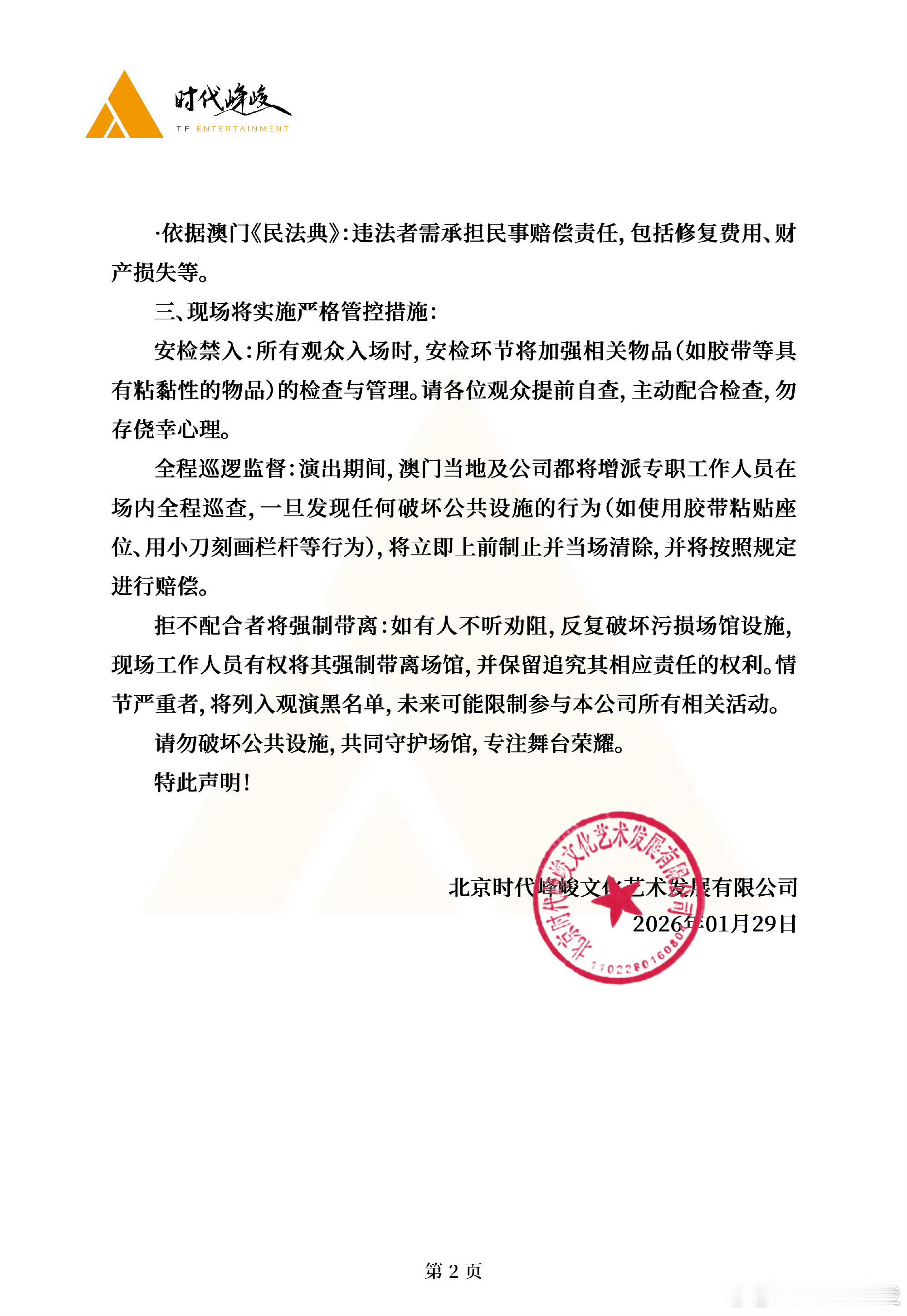 关于TF家族“荣耀之战”演唱会严禁破坏场馆公共设施的严正声明