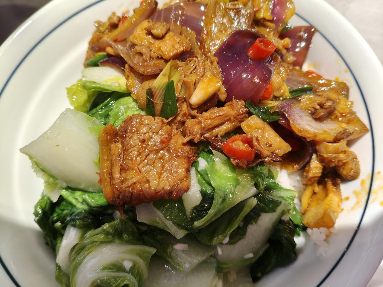 洋葱炒肉片,新鲜的洋葱,炒新鲜的肉片,吃嘴中,香而不腻,软而不干,清爽可囗,呵气如兰,洋葱的新鲜和肉的香美,辅以佐料混出美滋滋的午餐! 令一个是素炒大白菜,虽是素炒配以膏汤,香软可口,回味丝滑 中午配以米饭少许,吃的舒服!