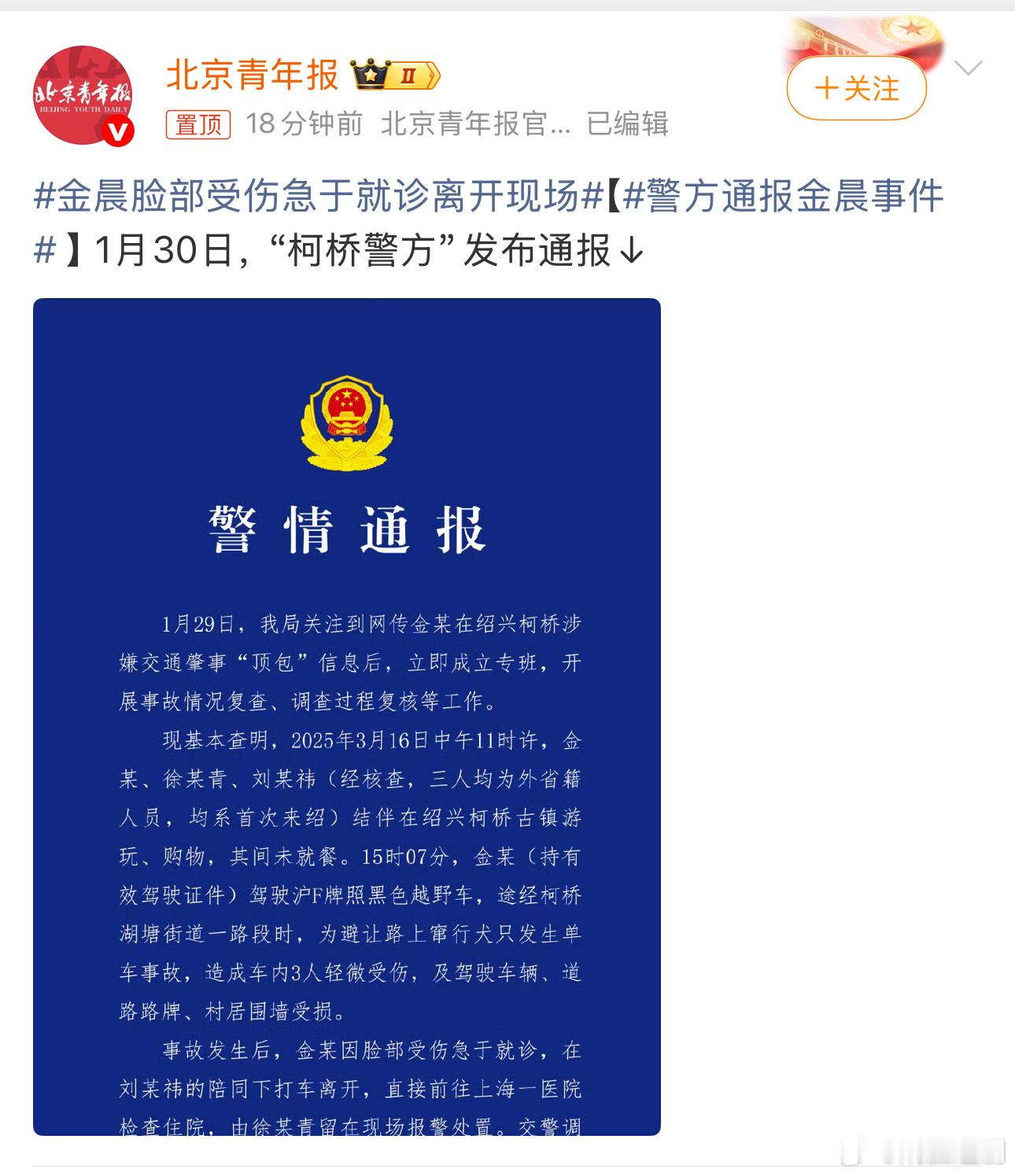 出通报了,金晨脸部受伤去医治了,朋友去顶包。情况特殊,这么说,金晨安全了?警方通