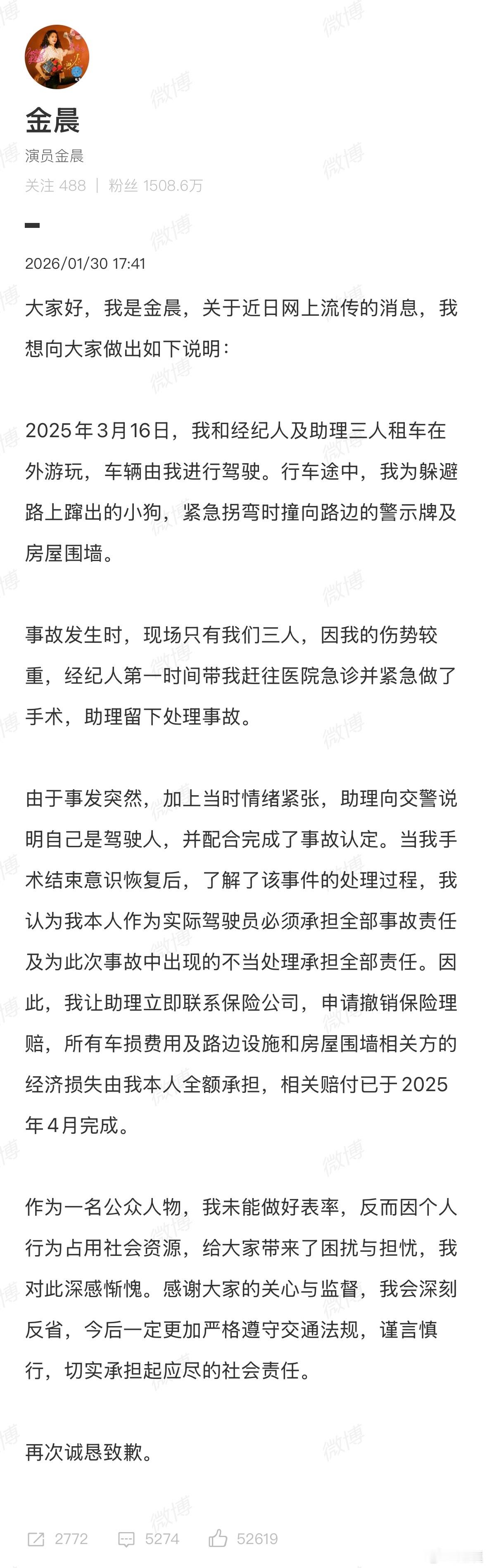 金晨道歉还发了当时事故受伤照片,看着确实真的很严重。