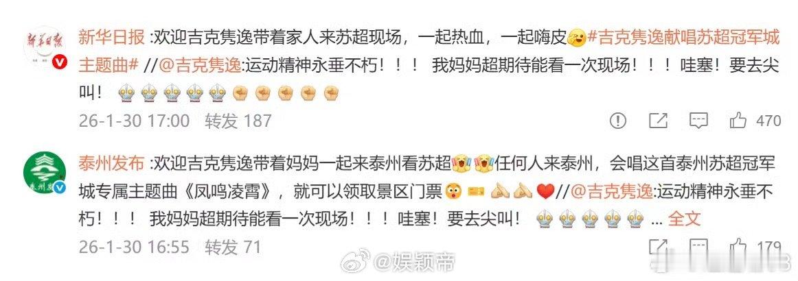 新华日报喊话吉克隽逸 总结:吉克隽逸与苏超的这次合作,始于燃炸的主题曲,暖于官方的亲情邀约。一首《凤鸣凌霄》展现专业实力,一句“带家人来”体现人文关怀,这波联动,赢得很彻底!
