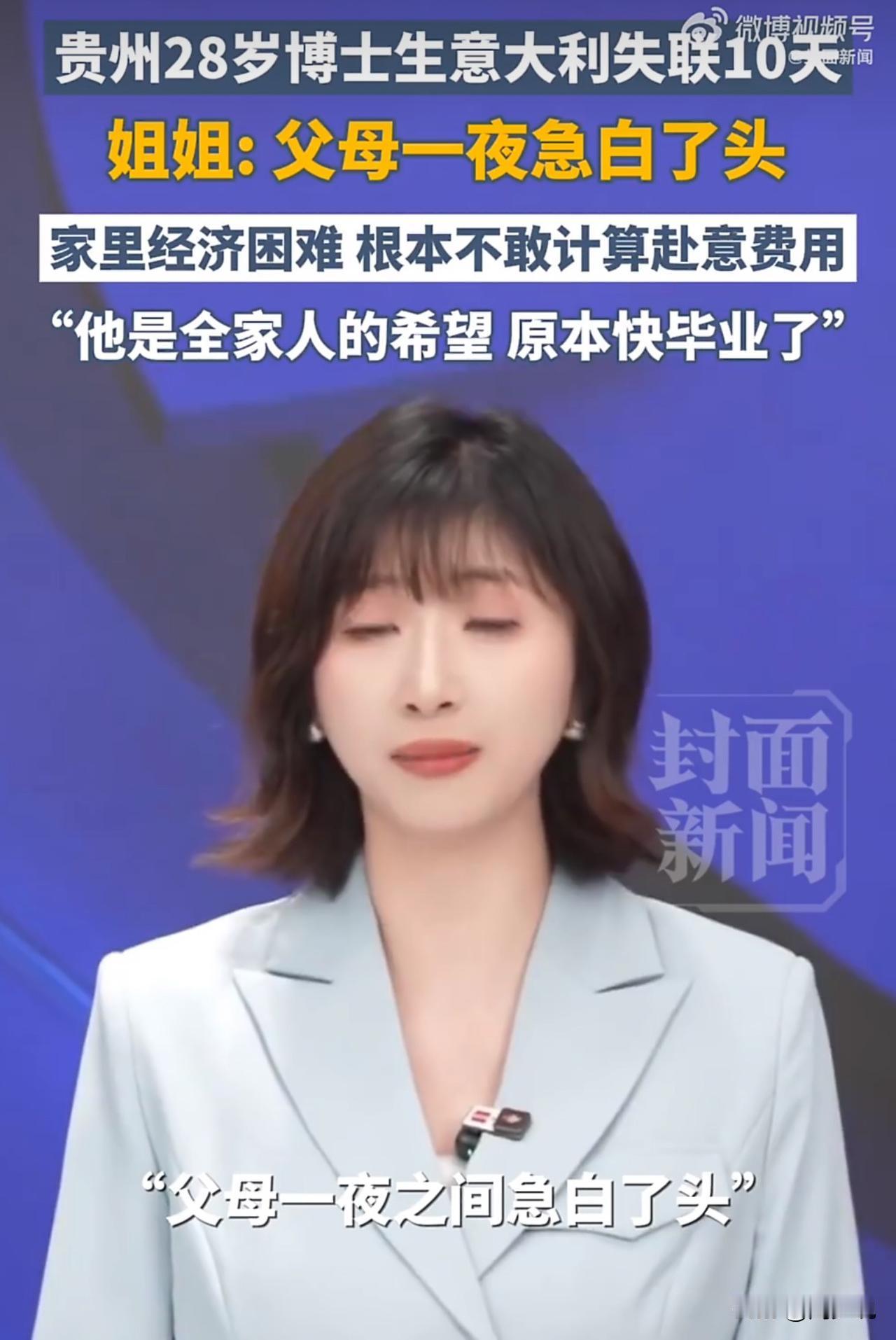 “太揪心了!”28岁贵州博士生黄鹏在意大利交换访学,失联已近十天。据该博士生姐姐哽咽着说,父母年近六十,常年在工地打零工糊口,家里还有90多岁的爷爷奶奶要照料。弟弟去年8月才出国,顺利的话今年就能博士毕业,谁能料到会出这样的变故。父母急得一夜白头,整个家都快被击垮了。更让人揪心的是,经济拮据、语言不通再加上手续繁琐,一家人连奔赴意大利的费用,都根本不敢细算。如今,在法国工作的表弟已请假,准备赶往意大利帮忙,同时也向当地华人发起了求助。 此事引发不少网友热议,有网友留言:“太心疼了,普通家庭供出一个博士生有多不容易,希望孩子能平安归来。” 还有人说:“异国他乡寻亲太难了,愿能有好心人伸把手。” 周少想说这件事戳中了无数普通家庭的软肋。一个寒门学子,熬过寒窗苦读走到博士阶段,背后是一家人倾尽所有的托举。 这场突如其来的失联,不仅牵动着亲属的心,更让我们看到普通家庭面对跨国困境时的无助。换做任何一个家庭,都无法接受突来的变故。 每一份来自异乡的援手,每一次善意的转发,或许都能为这个濒临崩溃的家庭,点亮一丝希望的光。希望大家可以尽一份绵薄之力,帮他们多一分找寻的可能。#寻美三湘# #长沙新朋友#