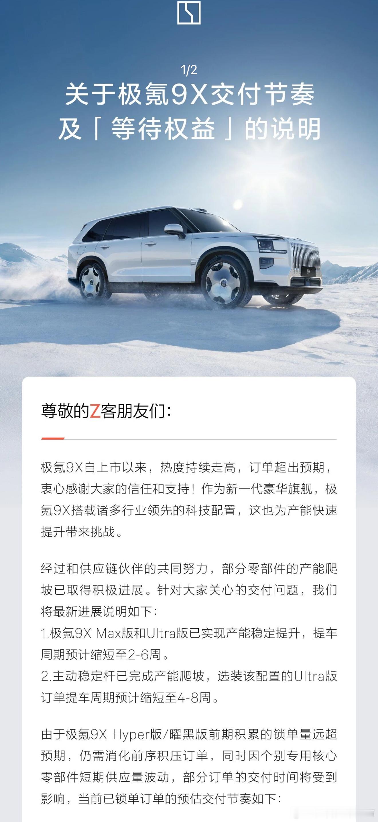 极氪9X到底有多火爆?极氪专门就交付节奏出了一篇推文并且如果超过期限未交付还新增了9X专属感谢金每天200元,至高累计12000元可用于抵扣购车尾款