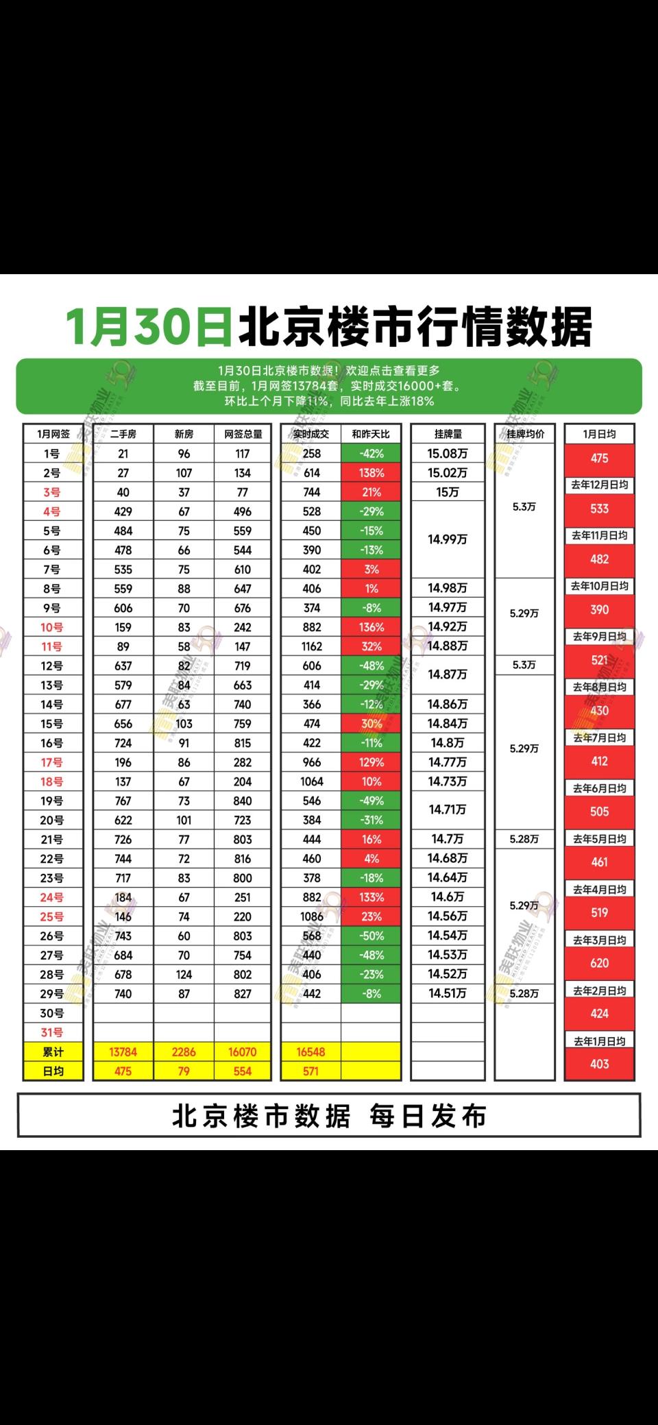 这张图里,隐藏着北京二手房市场的一个真相!你发现了吗? 我们平日里看到的北京二手房数据都是网签量,几乎看不到实时成交量。 下面这张图,小编不仅统计了网签量,还统计了难得一见的实时成交量,为关注北京二手房市场的人,提供了一个更为全面直观的视角。 图中显示,截止至1月29日,北京二手房网签量为13784套,而时实成交量则为16548套,这里隐藏着一个真相,就是网签量是滞后的,而且实际成交量要比网签量多很多。 有人说,15000套是北京二手房市场的荣枯线,如果按着成交量来算,1月北京二手房市场还是个相当不错的成绩呢! 大家觉得呢?