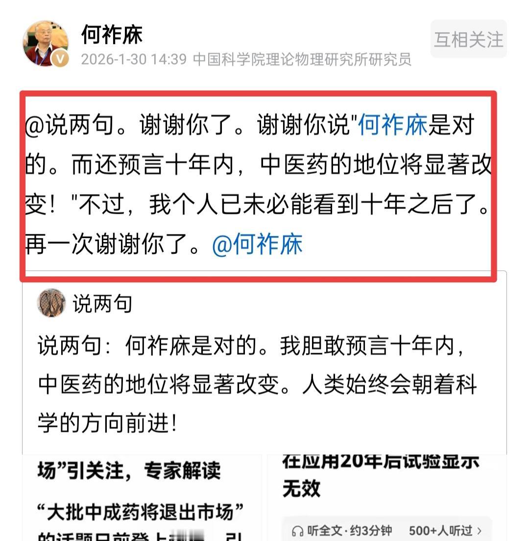 1月30日下午两点多钟,何老院士支持十年内中医药的地位将显著改变的观点。随后,何老院士一声长叹,叹的是未必能看到十年之后的光景了。 中医药的地位将会进一步提升,这是肯定的。目前,对中医药发展的支持力度越来越大,而大批中成药退出市场,正说明未来会用更科学的方法检验药品效果。这样一来,大众在使用这些药品后,对其信任感也会随之增强。 从国际领域来看,中医的影响力如今也在不断提升。像中医针灸,便是中华医药的瑰宝。相信经过市场的大浪淘沙,中医药在国际上的认可度与影响力,必将得到进一步提高。