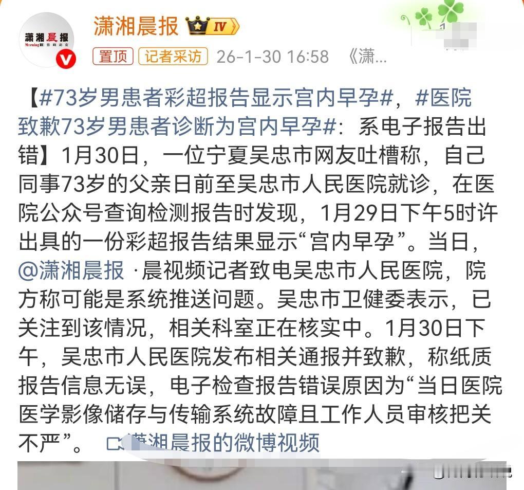 这种离谱事不是个例,也是经常的被报道,医院报告又闹乌龙。 看来很多工作医务者工作确实太不细心了。 1月30日,有网友吐槽自己父亲的彩超报告太离谱。 因为他的父亲73岁,那报告竟然显示宫内早孕。 一个大男人竟然报告上显示宫内早孕,这真的是太离谱了,这医院工作太不细心。 医院方面也选择了道歉。