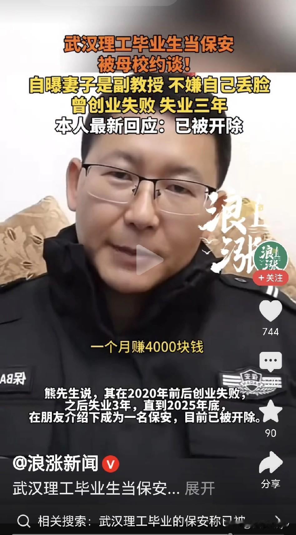 熊先生摊上事了! 蕞近直播时满脸沮丧:“保安也干不了了,被开除了!” 为啥? 因为直播时,多次提到母校,学校怕玷污名声。 直接约谈委婉提了看法。 原来他是武汉理工的一名大学毕业生。 2008年毕业,历经多次创业失败,失业3年在家。 蕞后应聘保安录取。 正如他说的“风吹不着,雨淋不到,一个月4000块直接花不完”。 不知是自嘲还是知足常乐,反正自己快乐就行。 万万没想到! 竟被母校约谈,说是干保安丢了学校的脸。 学校本来是他值得骄傲和自豪的, 这次却成了压死骆驼的蕞后一根稻草! 熊先生长相气质俱佳,妻子是大学教授,对他干保安很支持! 他一不偷二不抢,靠自己的本事挣钱吃饭,有什么过错? 武汉理工这是怎么啦? 莫不是像武大那样,为了保全脸面,直接砸了人家的饭碗吧?