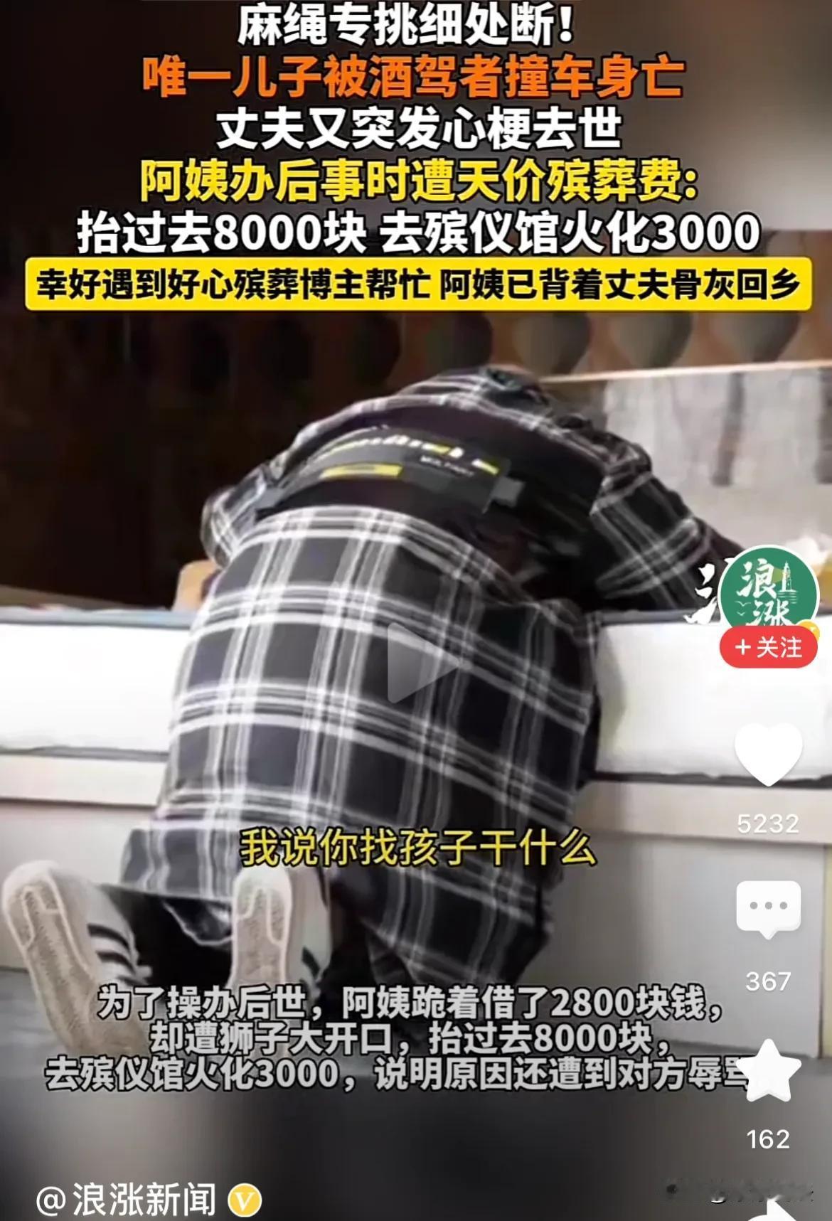 麻绳专挑细处断!辽宁大连,女子唯一的儿子因交通事故死亡,丈夫接受不了现实突发心梗去世。三口之家就剩下女子一人。她强打精神,借了2800元给丈夫处理后事,谁知竟遭到了殡仪馆坐地起价:抬人8000,火花3000。女子想便宜点,却被对方辱骂。多亏一好心的殡葬博主帮忙,不仅按最低价完成了葬礼,事后还给她1500块钱,这经历扎心了。 屋漏偏逢连夜雨,麻绳专挑细处断。辽宁大连的一女子经历的事情,可是比黄连都要苦。 事情的大致是这样的,女子跟丈夫结婚以来,儿子很快就出生了。由于家庭条件一般,为了给儿子一个良好的生活条件,丈夫跟女子商量,他俩就要这一个孩子就行。 儿子一天天的长大,眼瞅着就要到了成家的年纪,女子盼星星盼月亮的等着未来儿媳妇上门,结果儿媳妇没等到,却等来了医院的电话。 在得知儿子被一酒驾者撞车身亡后,女子简直不敢相信自己的耳朵。她强打起精神,跟丈夫火速赶到了医院。 当看到蒙着白布的病床后,女子只感觉两眼一阵发黑,呼吸也变得困难起来,整个人变得摇摇晃晃。 女子正要倒下,身旁的丈夫却突然倒在地上。女子被吓了一跳,她知道丈夫的身体并不好,这次突然晕倒,十有八九是脑梗复发了。 虽然丈夫很快被送进了医院进行抢救,可由于病情并不乐观,抢救也未能成功,还是不幸去世了。 人没了,家底也被掏空了,在这一刻,女子几乎失去了继续过下去的勇气。可丈夫的后事还没人处理,就算再怎么难过,女子也必须咬牙坚持。 丈夫临终前曾叮嘱女子,他死后不用怎么操办,简简单单就好。女子也明白,丈夫是舍不得花钱。 葬礼的衣服可以不用买,可火化总得花钱吧?女子身上没有钱,实在没办法了,只能跟亲戚借了2800块钱。 可是等她拿着这些钱来到殡仪馆的时候,没想到工作人员却坐地起价。 抬人收费8000元,火化收费3000元。 女子身上就2800块钱,就是火化的费用也不够。 丧子又丧夫,这样的经历就像是她心里的一道伤疤,可是为了能让丈夫顺利火化,女子无奈再次揭开这道伤疤,只希望对方能可怜可怜她。 谁知对方不仅没有可怜她,反而还对她冷嘲热讽起来,质问女子:没钱你打什么电话? 女子被对方噎的一句话说不出来,只能无奈的看着对方扬长而去。可丈夫的遗体总不能就这么放着,实在走投无路的女子只能尝试着寻求网络上的帮助。 经过一番搜索,她得知一丧葬博主很有担当也很有爱心,于是尝试着与其取得联系。 在大致了解了事情经过之后,这位博主决心帮助这位女子,他以最低的价格帮忙办理了其丈夫的后事,处理完这些之后,又给了女子1500块钱。 最后的最后,在这位博主的帮助下,女子用儿子生前用过的背包,装着亡夫的骨灰回到老家。 麻绳专挑细处断,女子短时间内经历了儿子、丈夫先后离世的悲剧,一个完整的家变得支离破碎。还没等女子缓过劲来,接着就遭遇了殡葬工作人员的刁难。 有人说,女子本弱,又有谁知道女子到底是怎么挺过来的? 也有人说,殡葬行业有存在的理由,可由于行业的特殊性,导致对这个行业缺乏有力的监管,漫天要价、一口价各种收费项目层出不穷。 为什么殡葬行业能如此“有恃无恐”?无非就是利用了亡者家属想让自己的家人体体面面的离开。 穷也好,富也罢,每个人都要走到那一步。殡葬行业要想经营,需要有利润的维持,这无可厚非,可是能不能讲点底线? 对此你怎么认为呢?关注@康康说法 多学法律少吃亏。
