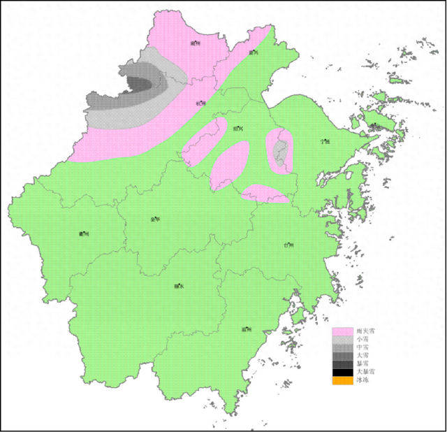 今天夜里至明天,杭州山区雨夹雪或雪,局部有冻雨,高山区局部大雪(最大积雪深度5-8厘米),明天早晨前后和明天下午到夜里部分平原地区有雨夹雪;明天后半夜雨雪渐止转阴天。