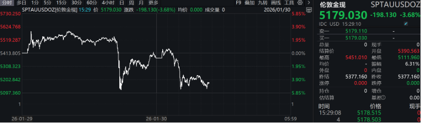 昨夜全球宏观情绪退潮,今天有色板块大跌。现货黄金日内振幅近500美元,亚盘再度逼近5600美元,但仍未能站上整数点位,并在美盘急转直下;随后又上演V形反转,收复超200美元,最终收跌0.85%,报5377.16美元/盎司;现货白银也同步剧烈波动。