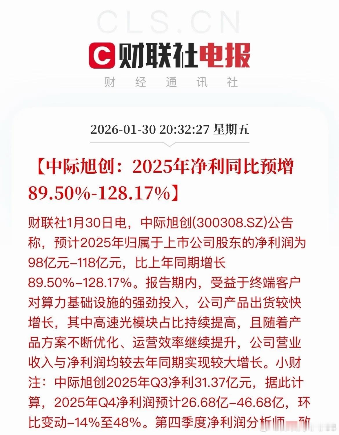 作为CPO三剑客“易中天”的易和中今日发布业绩预告!净利润均是大幅增长!具体来看,中际旭创净利润同比预增最高128%!新易盛净利同比预增最高249%!四季报更是超出市场普遍预期!