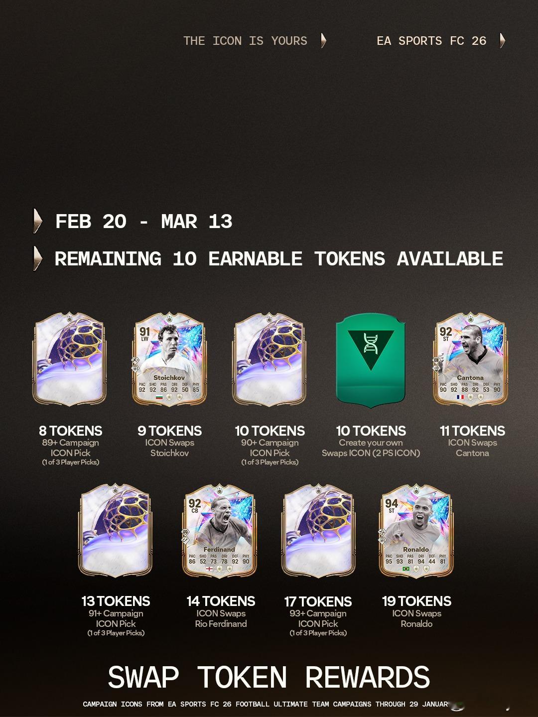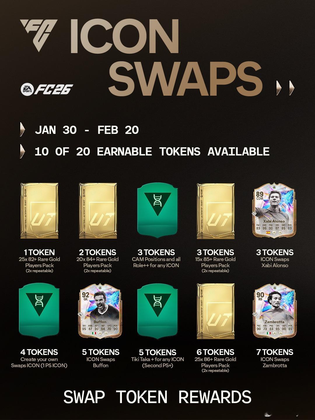 1月31日新增SBC:✦ 25 名 82+ 稀有黄金球员组合包✦ 20 名 84+ 稀有黄金球员组合包✦ 15 名 85+ 稀有黄金球员组合包✦25 名 86+ 稀有黄金球员组合包✦ Xabi Alonso✦ Gianluigi Buffon✦ Gianluca Zambrotta✦ Hristo Stoichkov✦ Éric Cantona✦ Rio Ferdinand✦ Ronaldo✦ 前腰位置和角色++(适用于任意超级巨星)✦ 超级巨星级防守球员突飞猛进✦ 超级巨星级进攻球员突飞猛进✦ Tiki Taka+(适用于任意超级巨星)✦ 89+ 活动超级巨星 3 选 1✦ 90+ 活动超级巨星 3 选 1✦ 91+ 活动超级巨星 3 选 1✦ 93+ 活动超级巨星 3 选 1✦ 明日之星挑战 1✦ 84+ TOTW 升级✦ 西甲一月最佳球员✦ Patrick Dorgu✦ Micah Richards