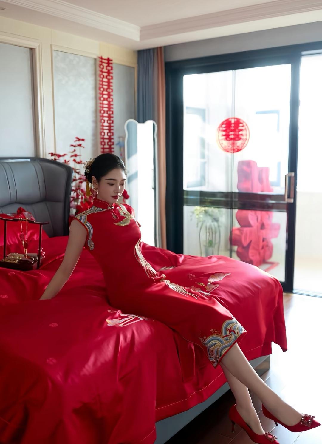 新娘穿着红色旗袍坐在床上,好喜庆!