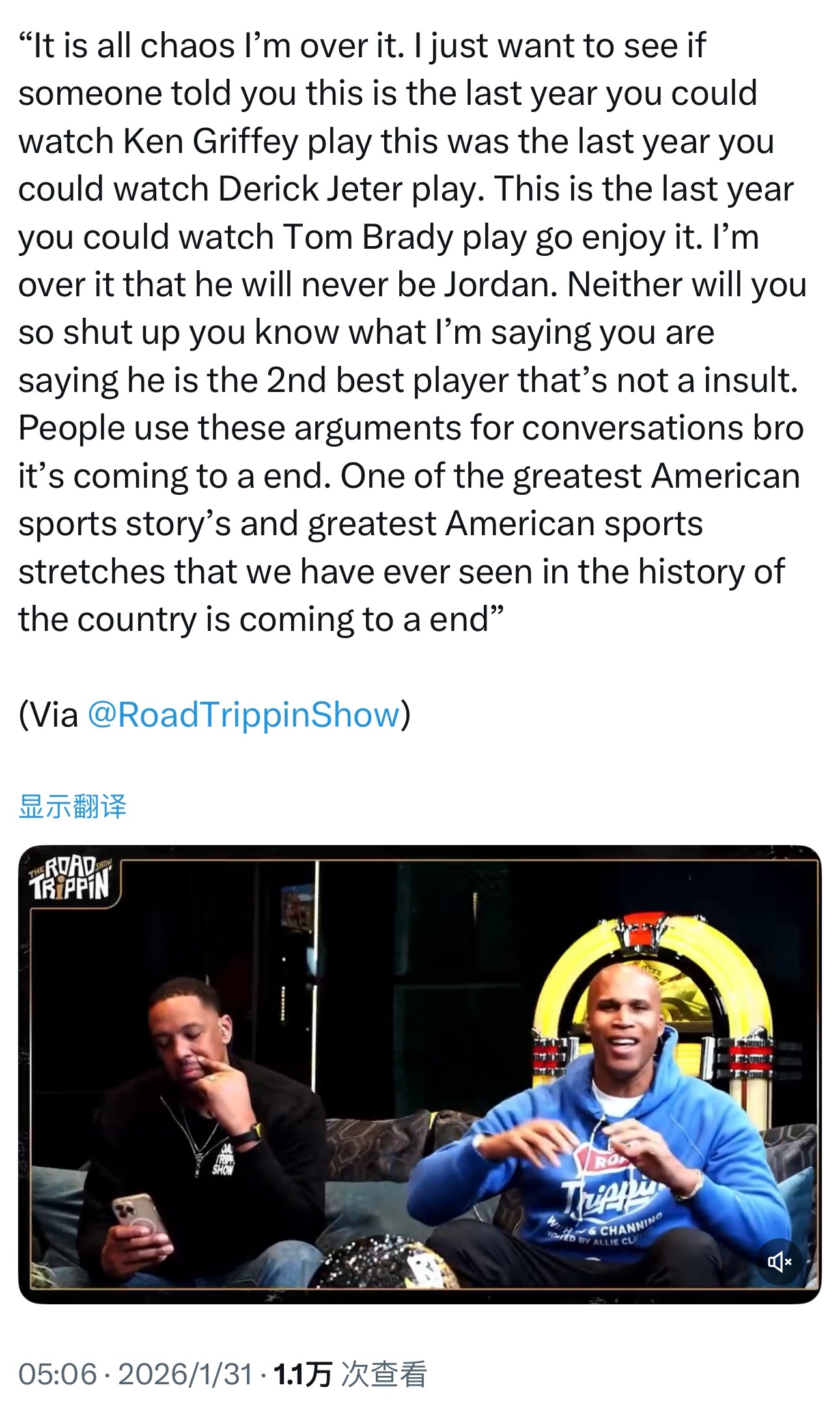“我已经烦透了那些争论。你想想,如果有人告诉你,这是你最后一年能看肯·格瑞菲打球、最后一年能看德瑞克·基特打球、最后一年能看汤姆·布雷迪打球,你肯定会去好好享受。我已经不在乎他永远成不了乔丹这件事了,你也成不了,所以别吵了。你们说他是历史第二,这根本不是侮辱啊,兄弟。大家总拿这些话题抬杠,但他的职业生涯真的要结束了。这是美国体育史上最伟大的传奇之一,也是我们见过的最漫长的巅峰期,而这些就要落幕了。”