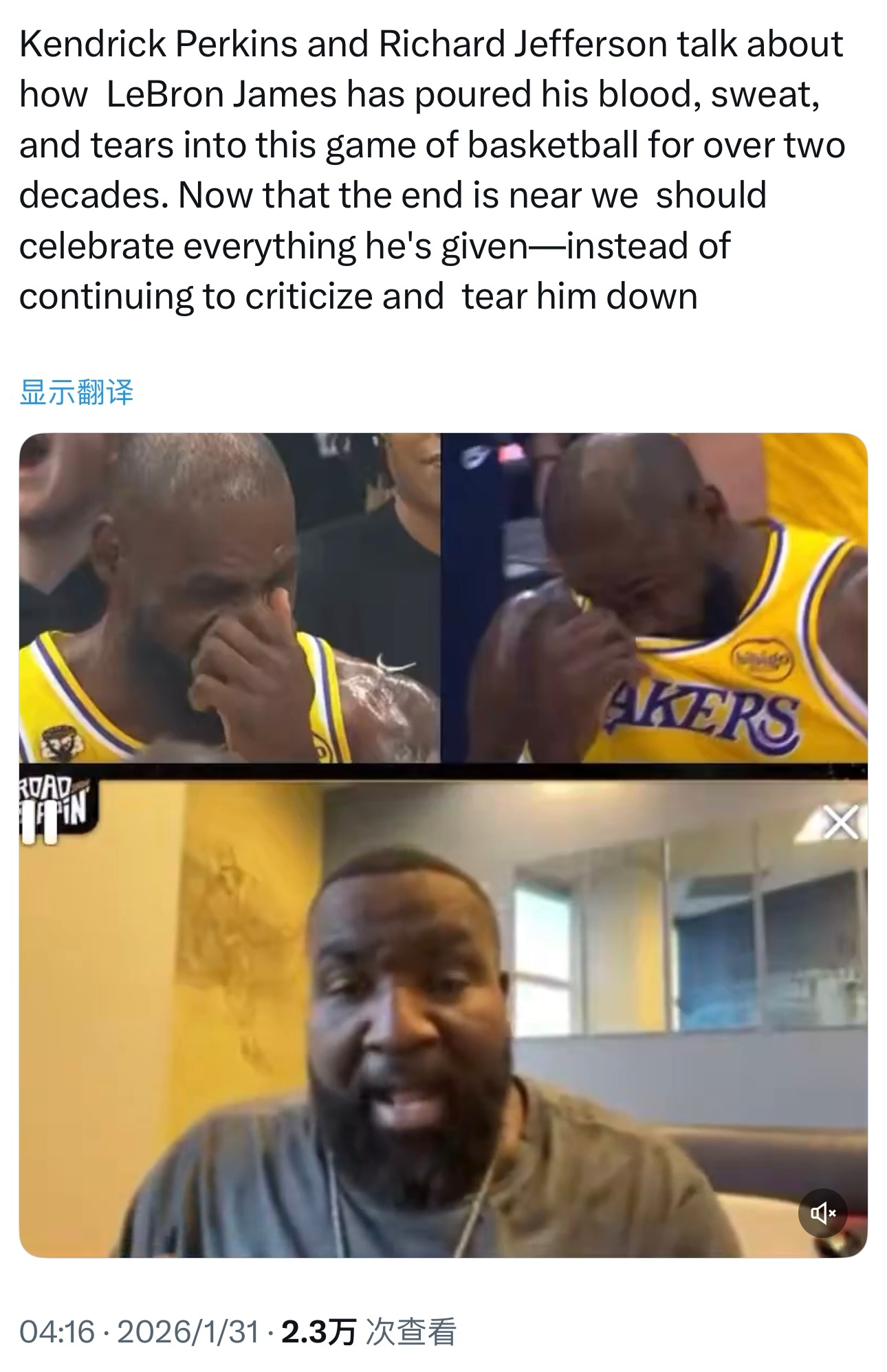 “詹姆斯在二十多年的职业生涯里,为篮球倾注了无数的血汗与泪水。如今他的生涯即将走到终点,我们应该去庆祝他所付出的一切,而不是继续批评和贬低他。”