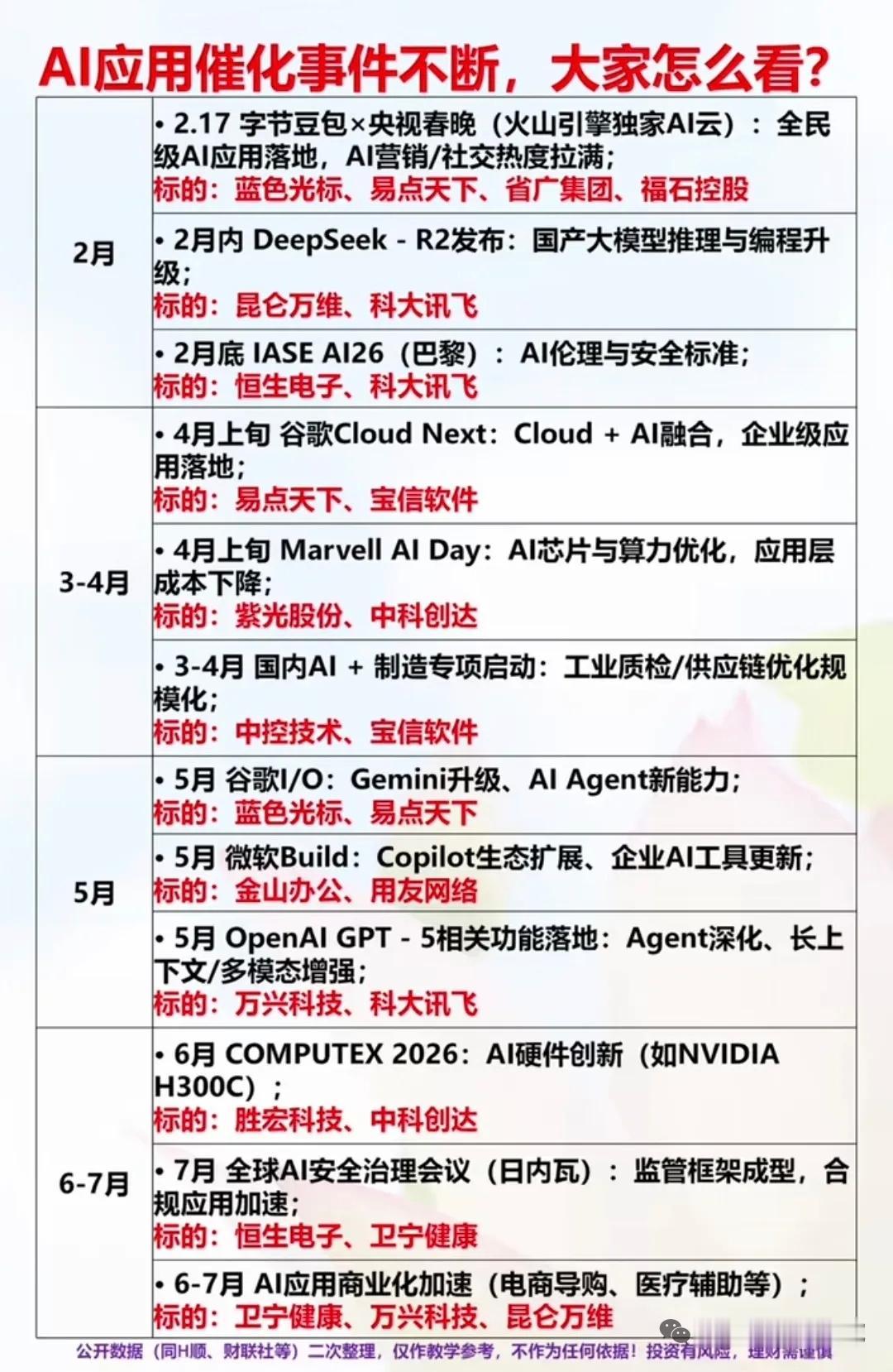2026年2月大A重要事件+全年AI催化前瞻,为你梳理投资日历,哪些板块值得提前埋伏?相关概念龙头代表有哪些? 2026全年AI催化事件前瞻,从全民级应用到全球技术峰会,从2月字节豆包登陆春晚引爆全民AI热度,到DeepSeek-R2推动国产大模型升级,再到谷歌、微软的年度技术大会带来的AI Agent、Copilot生态新突破,一整年的AI催化事件已经排满。AI人工智能概念龙头代表有科大讯飞、宝信软件等等。 2026年2月3日脑机接口开发者大会(天津)召开,会议主题神经康复、医疗设备落地推进,关注创新医疗、三博脑科、汉威科技等。 风险提示:以上内容仅为事件梳理,不构成投资建议。