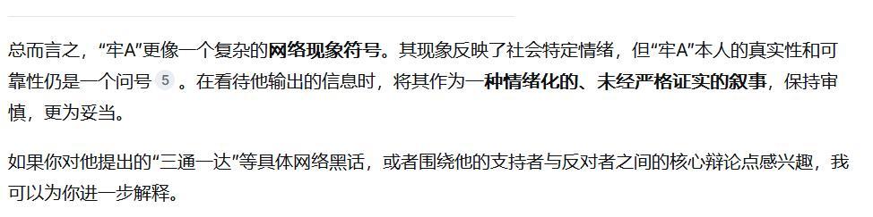 总而言之,“牢A”更像一个复杂的网络现象符号。其现象反映了社会特定情绪,但“牢A”本人的真实性和可靠性仍是一个问号。在看待他输出的信息时,将其作为一种情绪化的、未经严格证实的叙事,保持审慎,更为妥当。