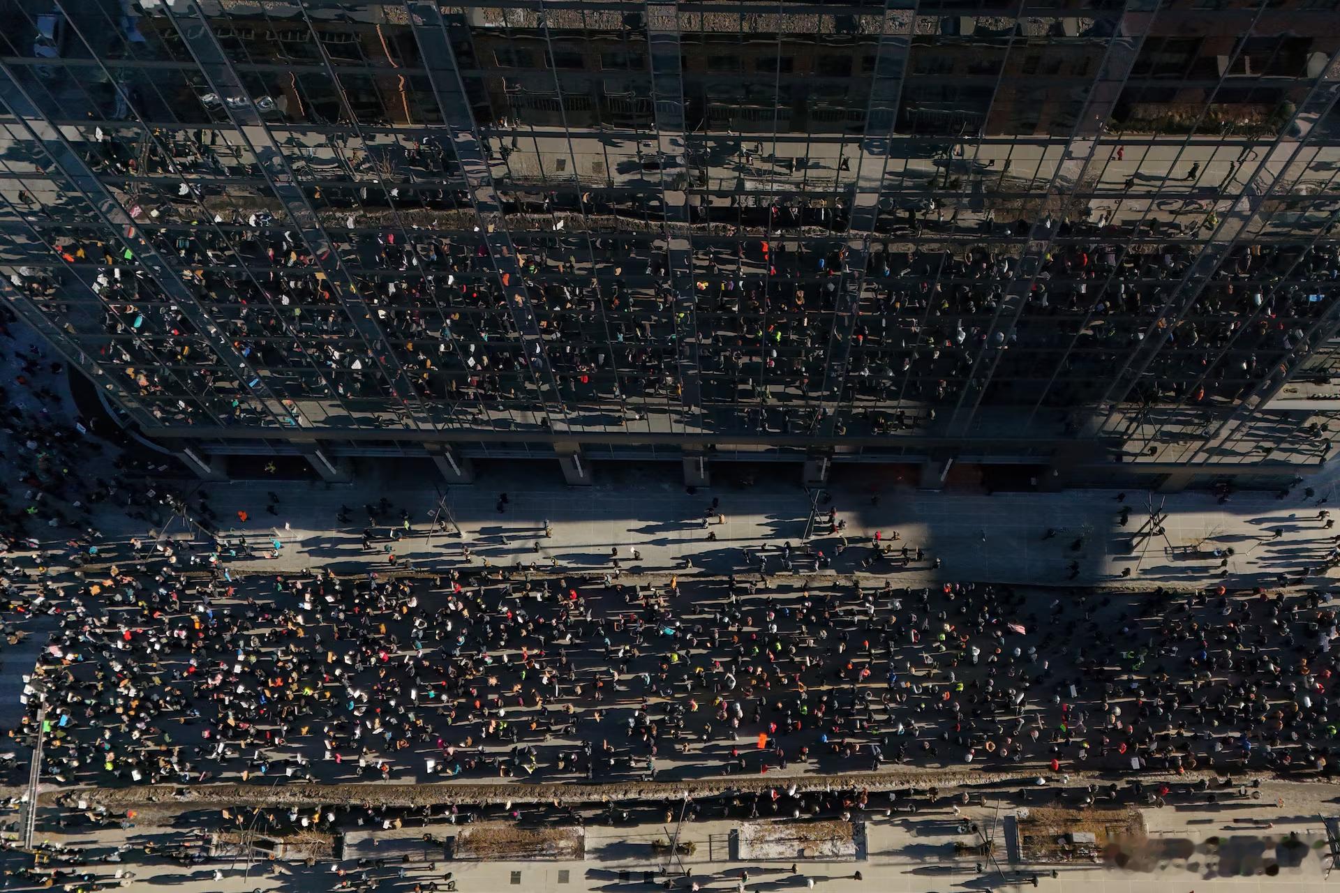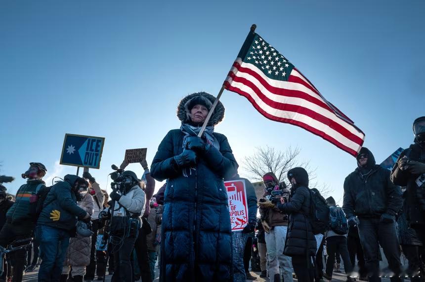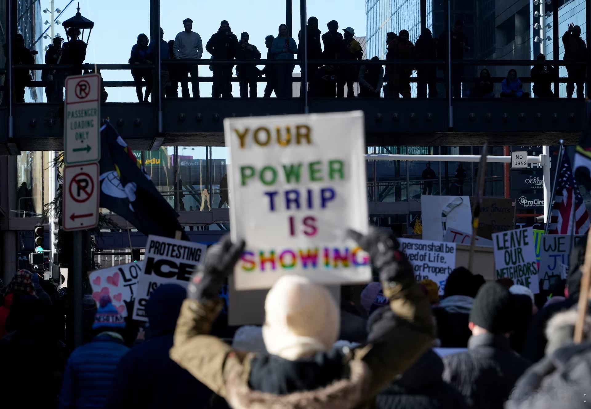 为了抗议美国移民和海关执法局的增兵行动和所采取的策略,数千人聚集在明尼阿波利斯市中心,当时气温低于冰点,其中包括带着小孩的家庭、老年夫妇和年轻的活动人士。