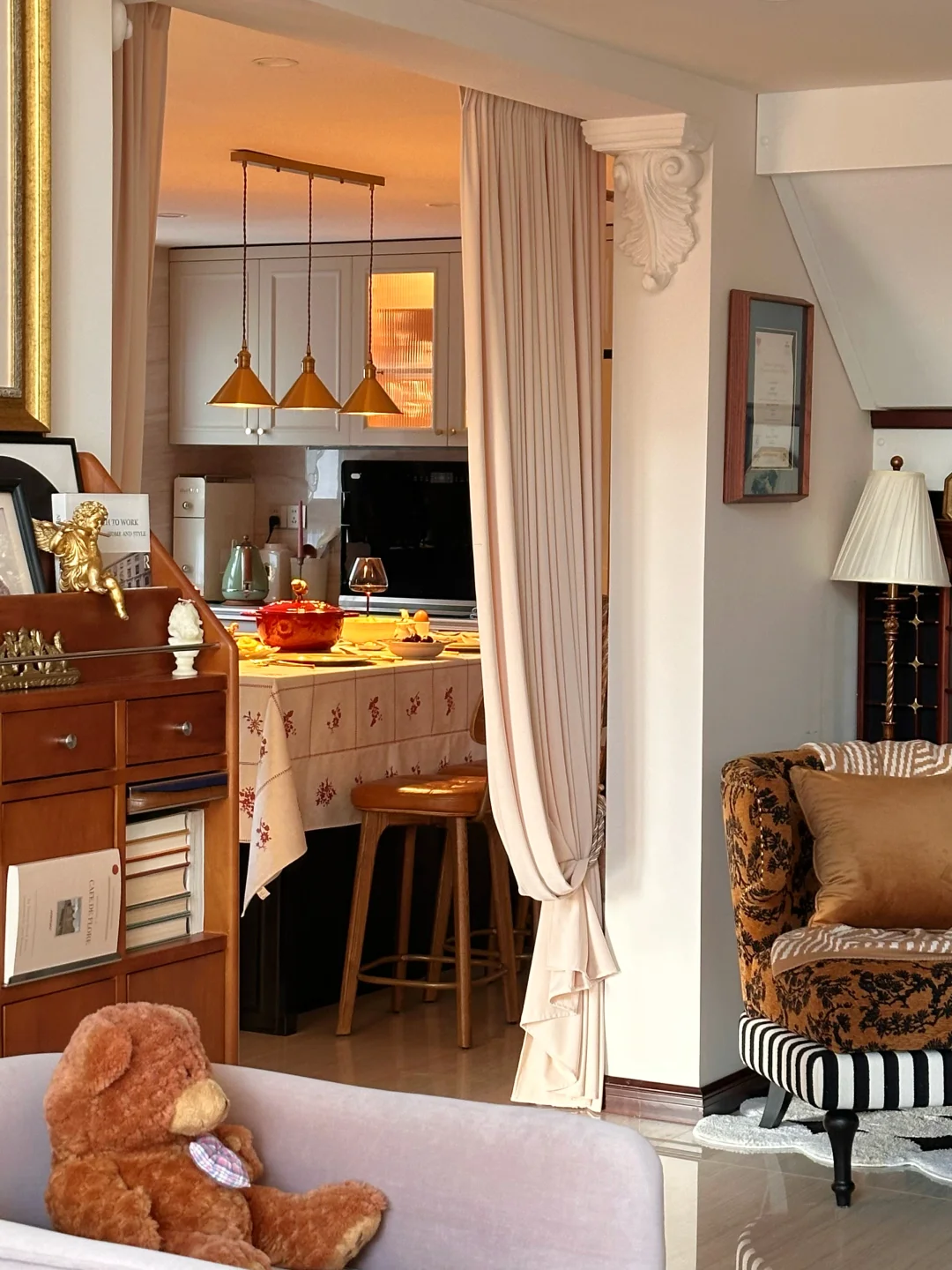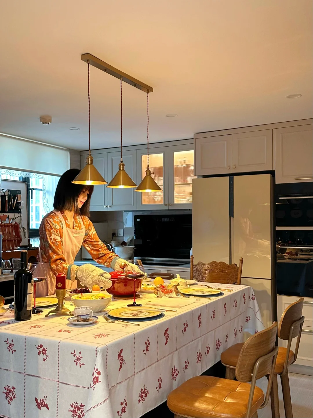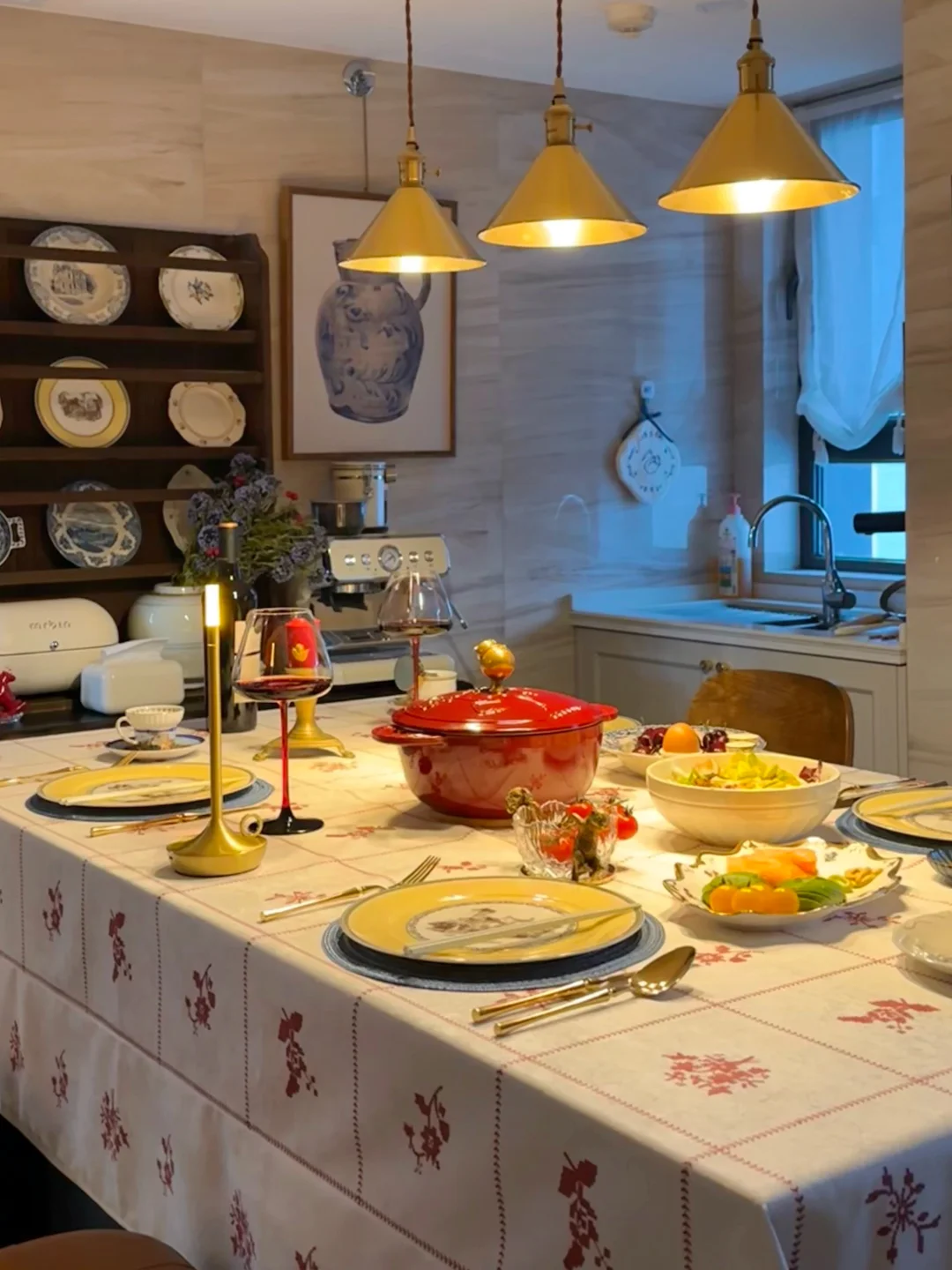 - 自从搬到这间公寓,每天清晨醒来,步入客厅,便见高挑开阔明媚的窗景。这个家似乎每个角落都可以坐下来,并随处拿起一本书翻看。在这个家,我比以往更感觉安宁。即使来到厨房,在宽大的中岛台前做早餐,也让我拥有在以往厨房里不曾有过的幸福感。或许,因为这里每一处都是自己亲手设计的。我比以前更宅,也更不愿意外食了。即使已经半年未出门旅行,也不觉得有多遗憾。 或许因为今年孩子开始在校就餐的缘故,三餐不再是急促的任务,让我更愿意花心思去琢磨餐厨美学,花些慢工夫做美味和布置仪式感,也更期待周末全家共同进餐的时光。给岛台铺上一块印花桌布;小窗户挂上刺绣三角帘;墙边定制了个盘子架,厨房就又多一分法式田园的味道。 之前经常分享我家装修的混搭心得,现在发现,餐厨区也可以有很多混搭乐趣。比如,我们经常看到一些心动的盘子、餐具,其实它们和家里的也可以混搭。现如今家居不必讲究都用成套的餐具,有一套白色的基本款就够了,那些各有特色的蓝白餐瓷、金边杯盘......风格相近却又不同的单品,完全可以单件买来混搭,丰富的餐桌更有生机。甚至不用购买昂贵的西式套碟,像我一样用圆形的餐垫衬托主盘就ok的,餐桌真的可以自由发挥。 把美学融入日常生活,漂亮的锅具也会让人更爱进厨房,这一点我也亲身验证。我喜欢用珐琅锅,一方面色彩好颜值高,是灶台和餐桌上的亮点;另一方面一锅多用,灶台视觉不乱。用它做锅咖喱海鲜或南瓜浓汤,端上桌,孩子拍手轻呼。食材在锅里发生着美拉德反应,在餐桌上呲呲冒着香浓的热气,顿时食欲满满,这就是美食配美器带来的幸福感。 临近岁末,新春与本命年即将到来,家里添置了许多红色软装和马的图案,连锅具都选了骏马浮雕配复古红的款式,祥马垂首踏蹄预意了“低头耕耘,抬头皆丰盈”的生活哲学。 生活美学,便是在这人间烟火中,为自己耕耘一片片鲜活又丰盈的风景。