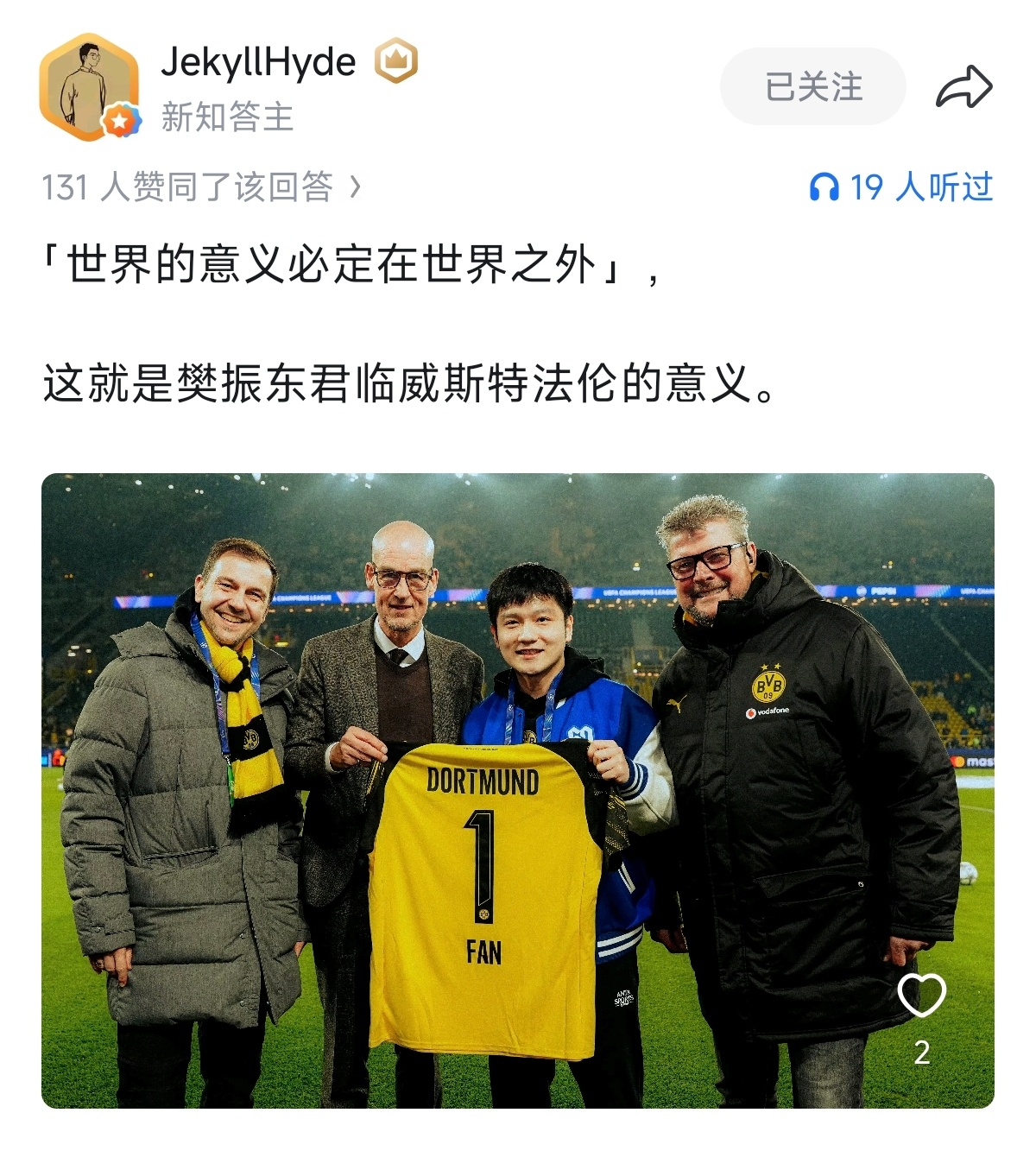 吴敬平眼光很独到用一句[世界的意义必定在世界之外]定义樊振东的作为,这句话它超越了语言的描述,需要用行动去感受去创造。真的被樊振东踏出的这一步爽到了!