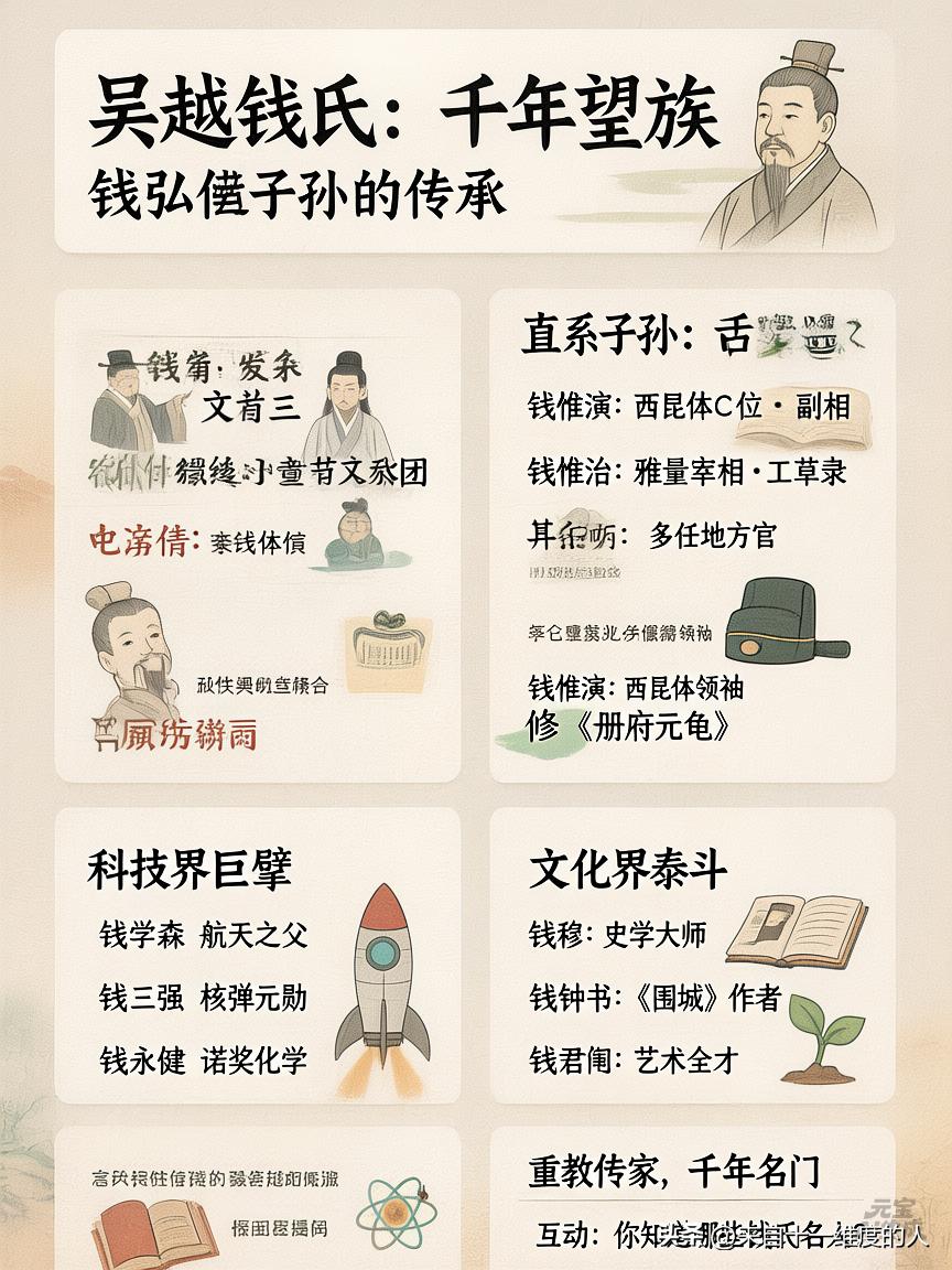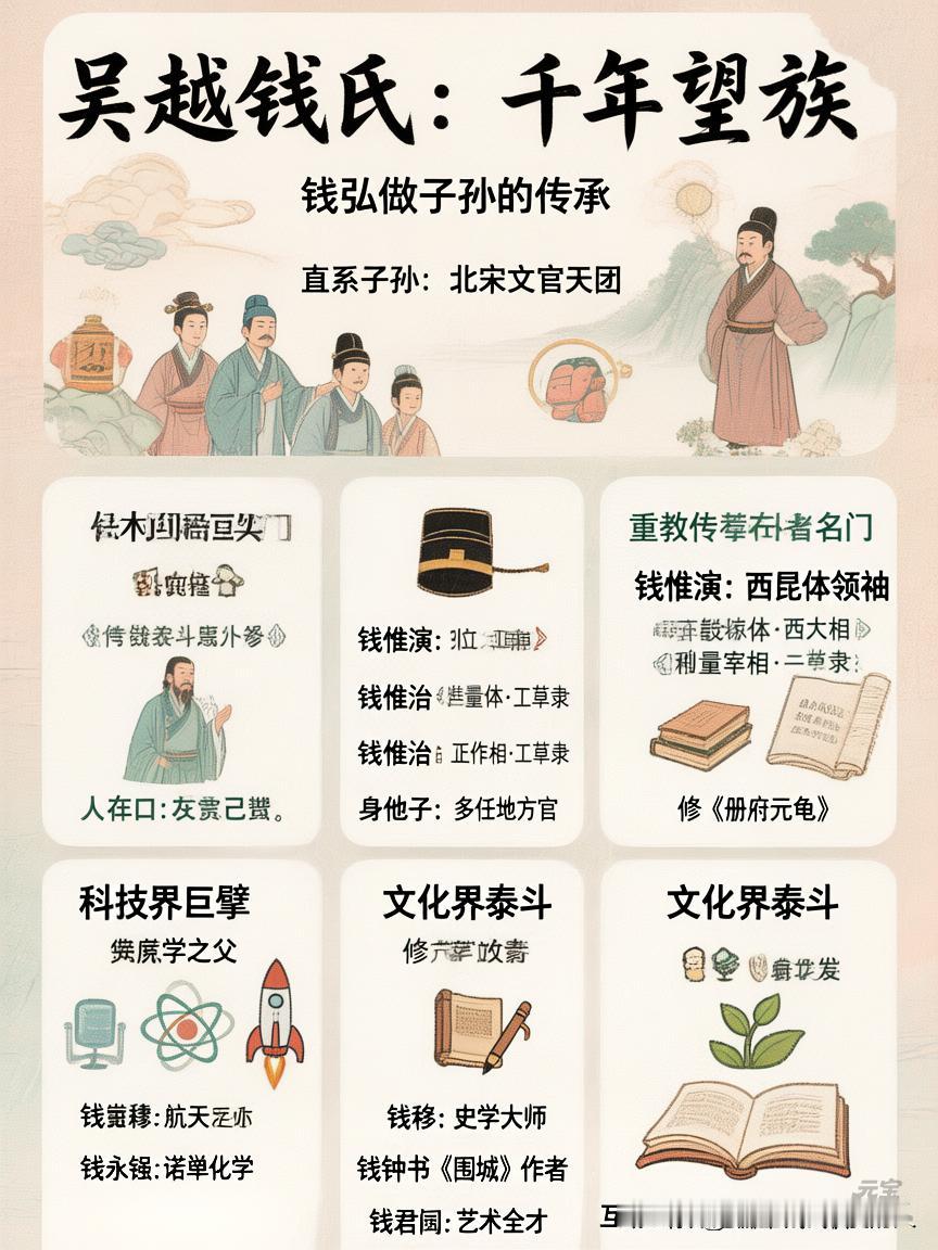 “谁懂啊!吴越国钱弘俶归宋后,子孙不仅没凉,还混成千年名门… 钱弘俶共有14子(一说15子),归宋后被赐宅汴京(今开封),授不同官职,部分子孙在北宋政坛、文坛活跃! 后世子孙如,科技界钱学森、文化界钱钟书都是他家后人!速看👉” 看图说话吧! 钱弘俶