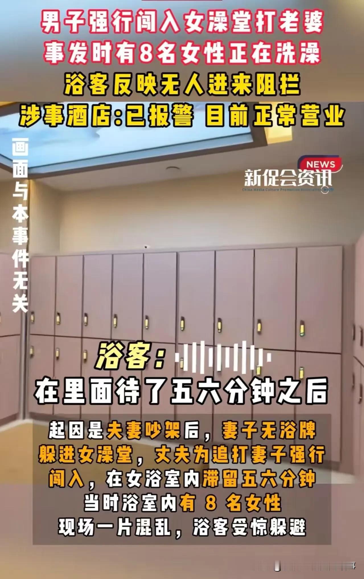 愤怒!男子闯女澡堂打老婆,8名女性受惊尖叫,滞留六七分钟拒不离开! 河南周口的这场闹剧,早已超出“家庭矛盾”的范畴—— 本该是私密放松的女澡堂,突然被一名男子强行闯入,目标直指正在沐浴的妻子。他不顾工作人员的拼命阻拦,在满是赤裸身体的澡堂里追打、辱骂,现场8名正在洗澡的女性吓得惊叫连连,慌忙躲避,羞耻与恐惧交织成一片混乱。 更令人发指的是,男子在澡堂内滞留了六七分钟,期间无视所有人的劝阻,仿佛这方隐私空间成了他泄愤的“战场”。 网友怒了:“这哪是打老婆?这是公然践踏女性隐私!是犯罪!”“不管夫妻间有多大矛盾,闯女澡堂施暴就是挑战底线,必须严惩!” 澡堂是女性的私密领域,是法律和道德都该守护的“安全区”。男子的行为,不仅对妻子实施了暴力,更对在场所有女性造成了精神伤害,涉嫌寻衅滋事、侮辱他人,性质极其恶劣。 家庭矛盾绝不是侵犯他人隐私、危害公共秩序的借口。这种突破底线的行为,必须依法严惩,给所有受害者一个交代,更要守住每个人的隐私安全线。周口澡堂 丈夫打 妻子 丈夫对妻子施暴 暴力洗浴 素材来源于网络,侵权删除。