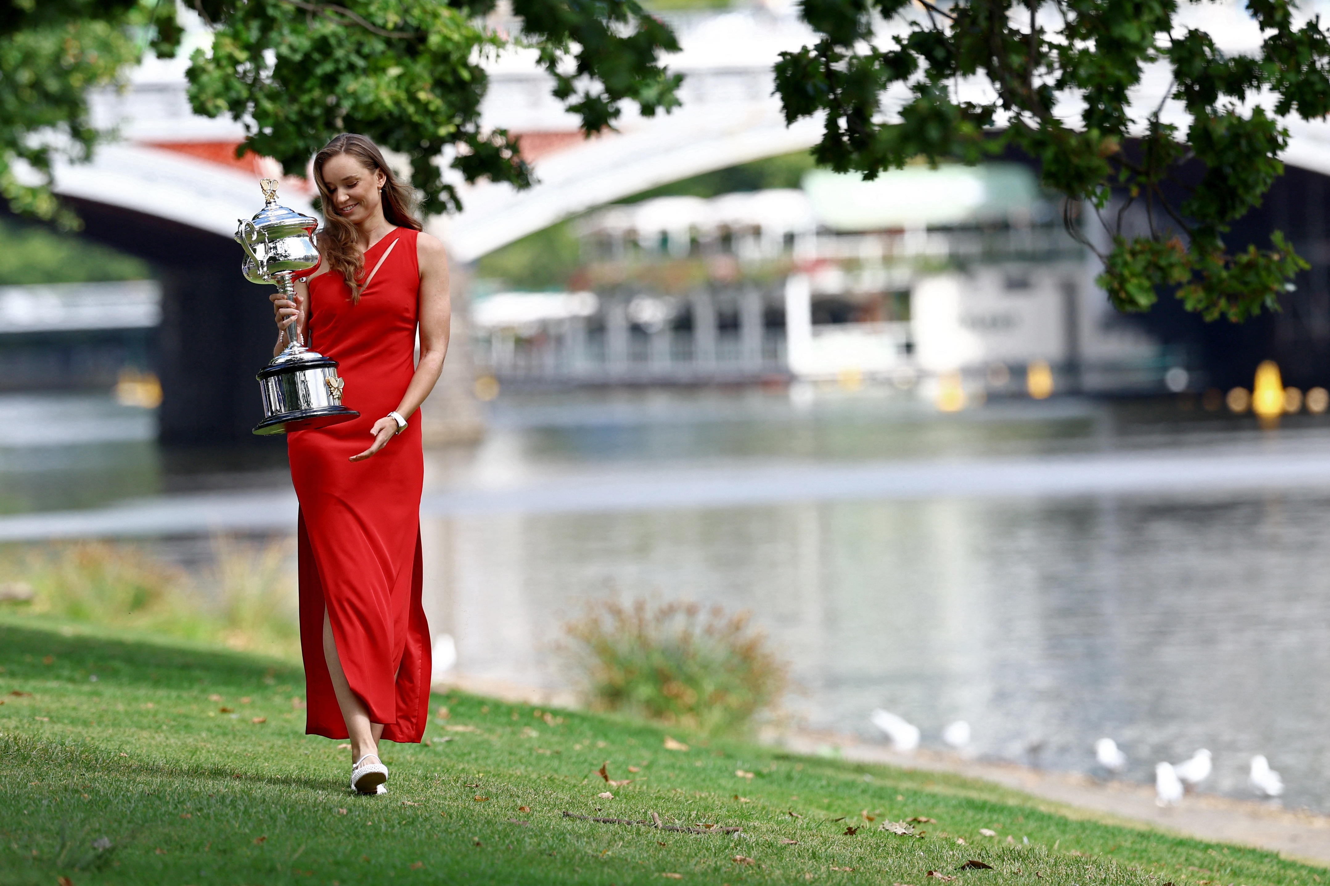 直播吧2月1日讯WTA官网晒图,莱巴金娜拿到澳网女单冠军后拍摄写真。