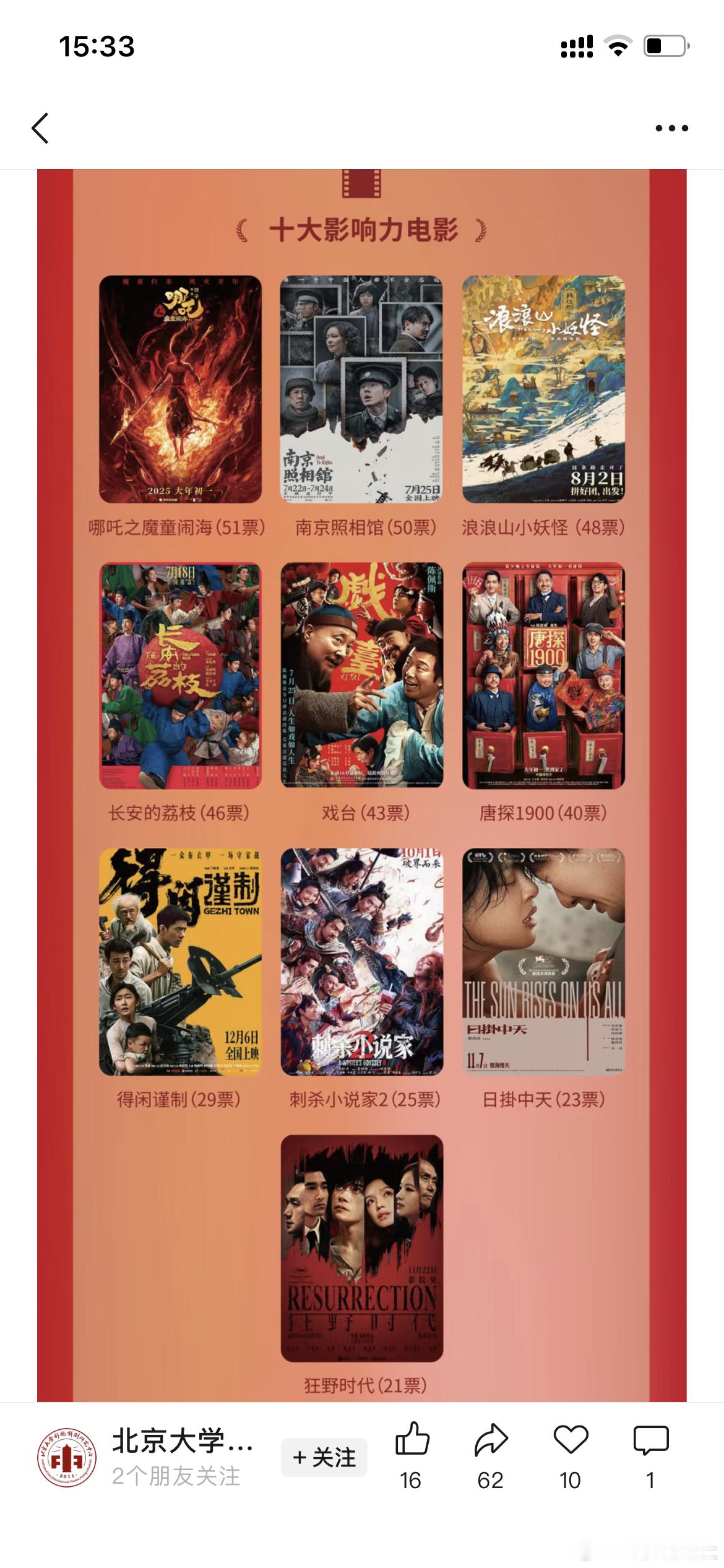 哪吒2年度十大影响力电影南京照相馆年度十大影响力电影 中国影视蓝皮书2025年度中国十大影响力电影,你看过哪一部?《十大影响力电影》唐探1900年度十大影响力电影 哪吒之魔童闹海 (51票)南京照相馆 (50票)浪浪山小妖怪 (48票)长安的荔枝 (46票)戏台 (43票)唐探1900 (40票)得闲谨制 (29票)刺杀小说家2 (25票)日掛中天 (23票)狂野时代 (21票)