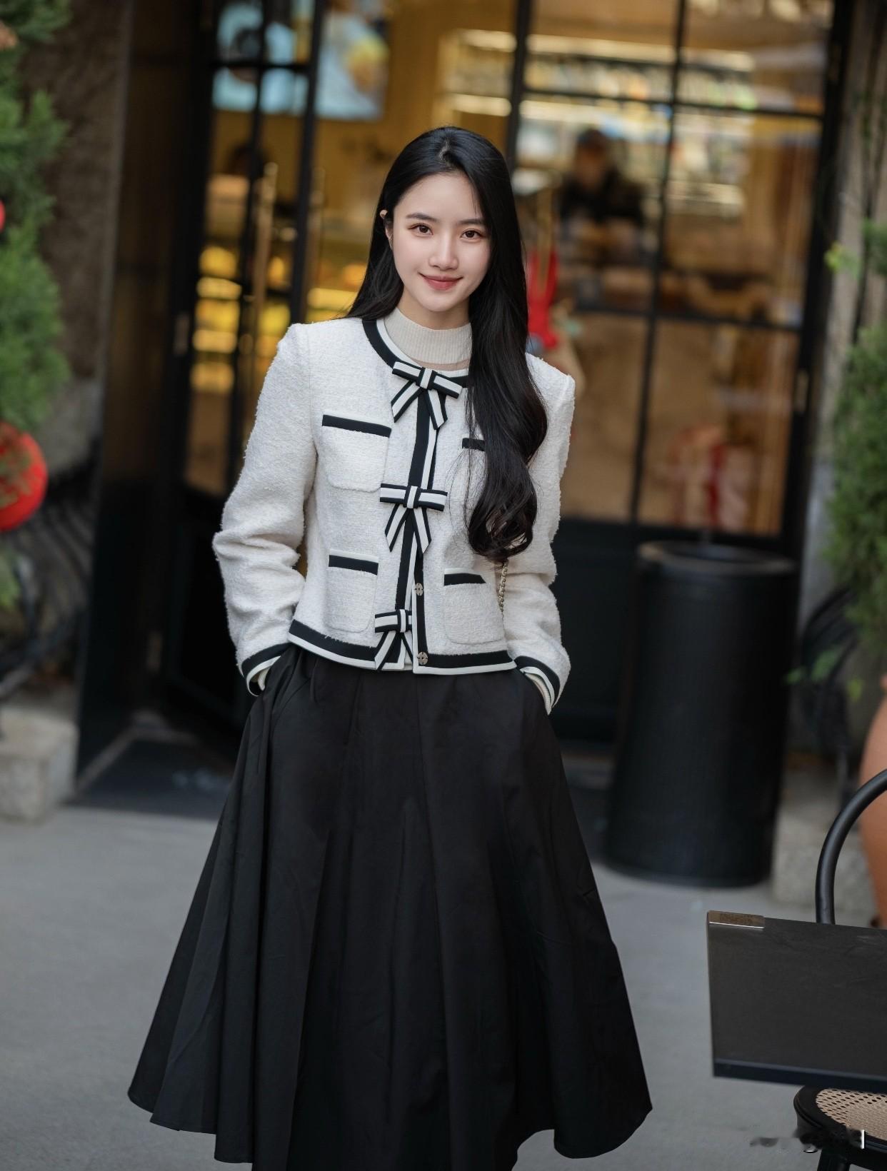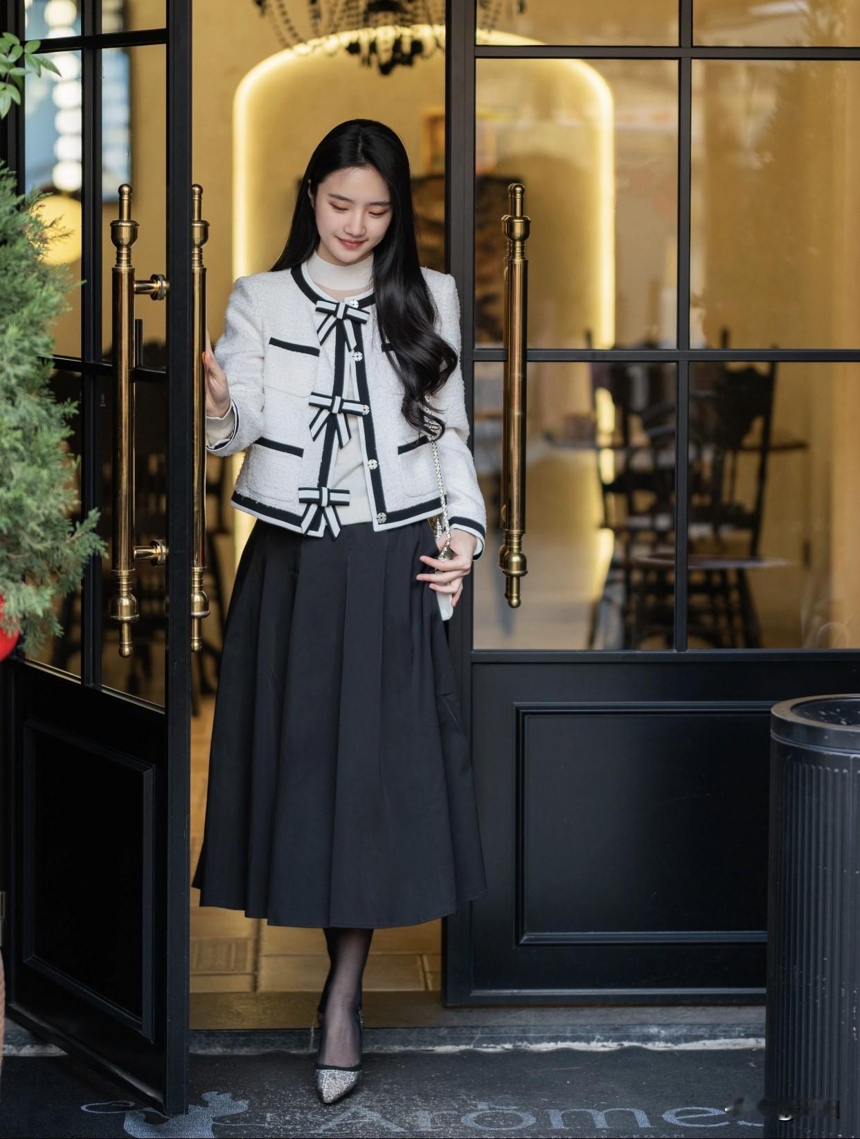 这套穿搭是干练的黑白职业装,把职场利落感与精致细节融合。黑底白边西装套装自带干练