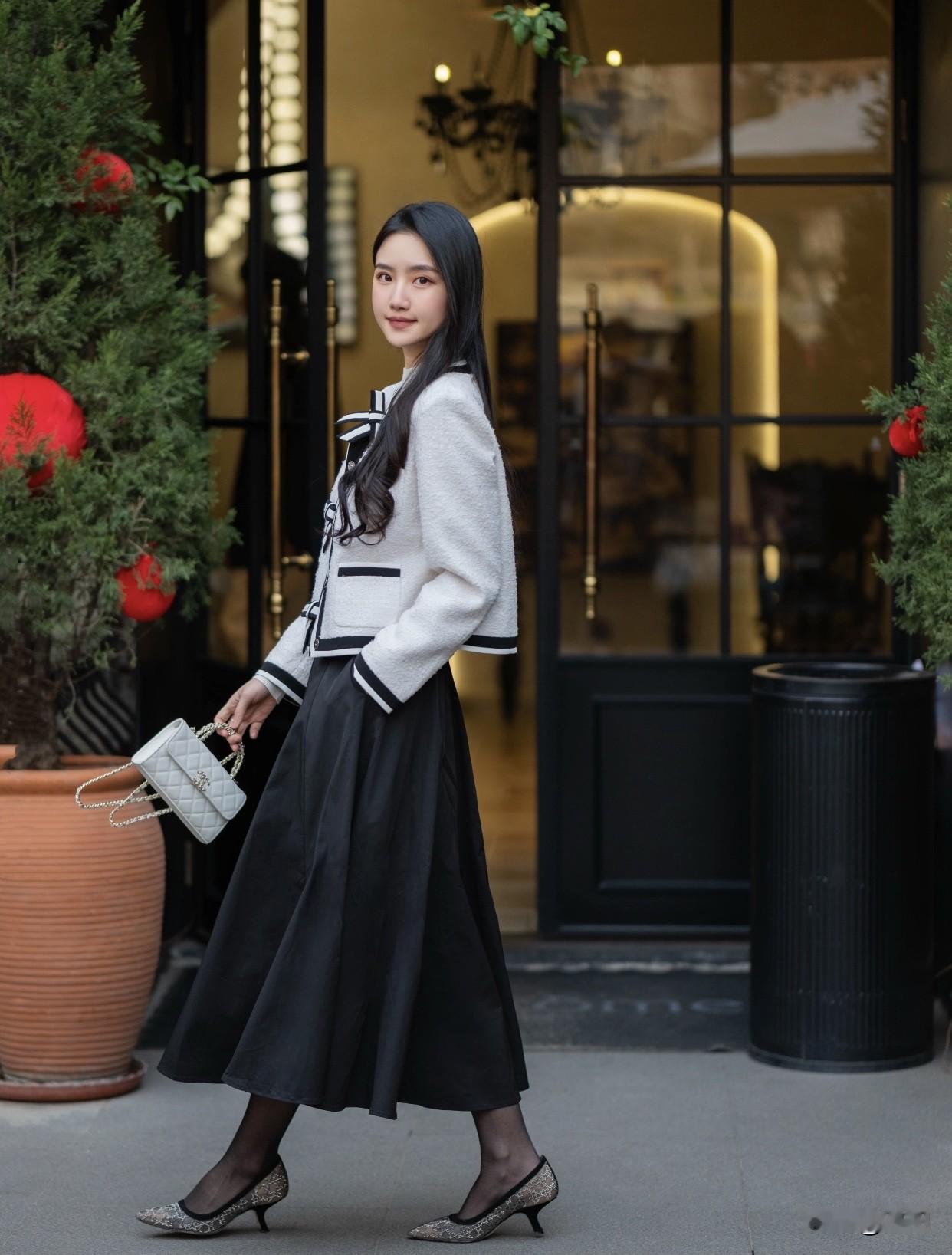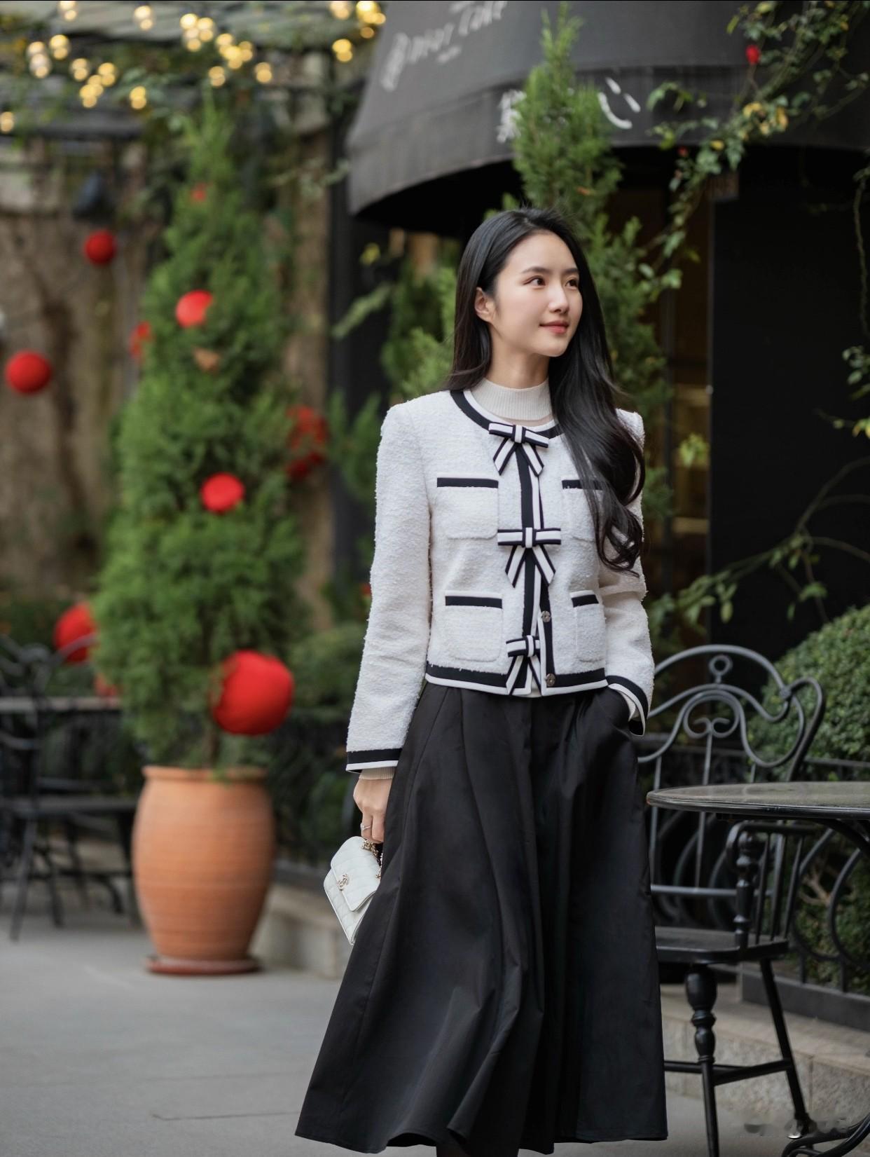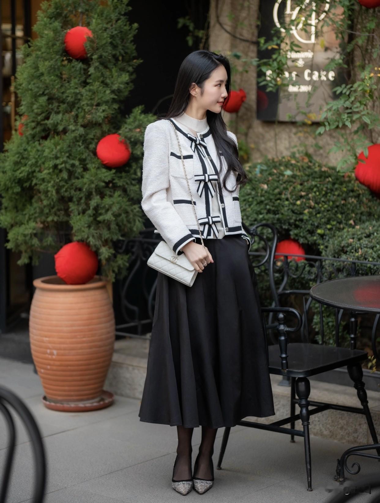 你觉得怎么样穿搭才更有气质呢?优雅冬日穿搭,黑白撞色毛衣搭配黑色长裙,手拿小包,